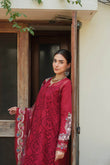 "Mahay," a symbol of summer allure, showcases a captivating red cutwork schiffli embroidered shirt front, complemented by a self-printed back and plain trousers that exude timeless elegance. The ensemble is further enhanced with exquisite organza patch motifs along the hem and solid sleeves adorned with vibrant cutwork rise motifs, adding a refined touch of sophistication. Paired with a beautifully printed and embroidered cotton net dupatta embellished with delicate emeralds and pearls, this outfit is designed to steal the spotlight at first glance.