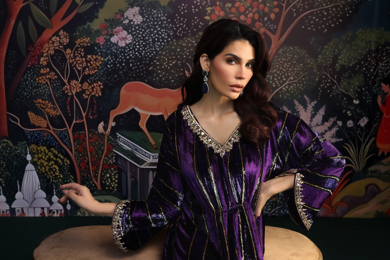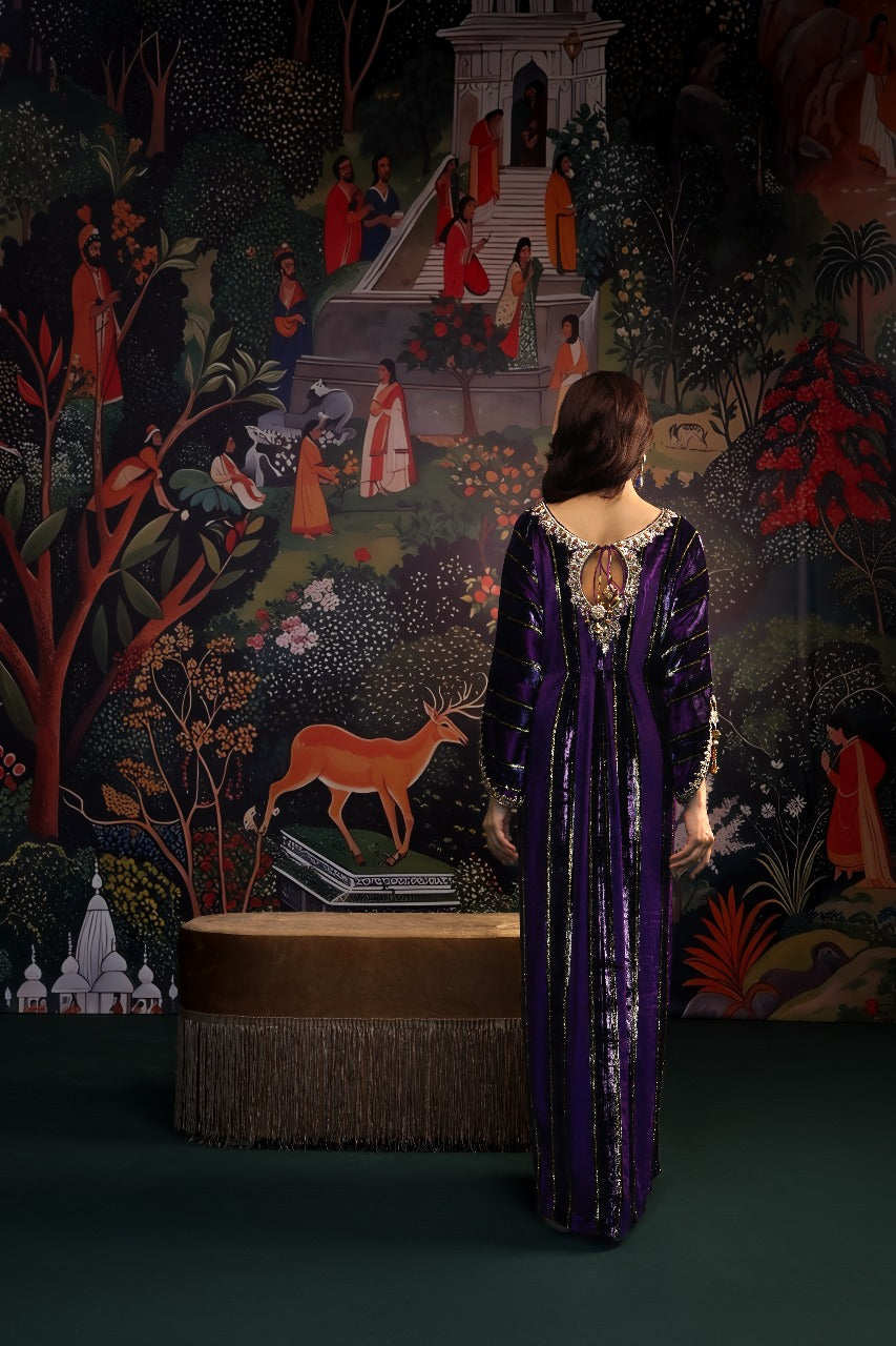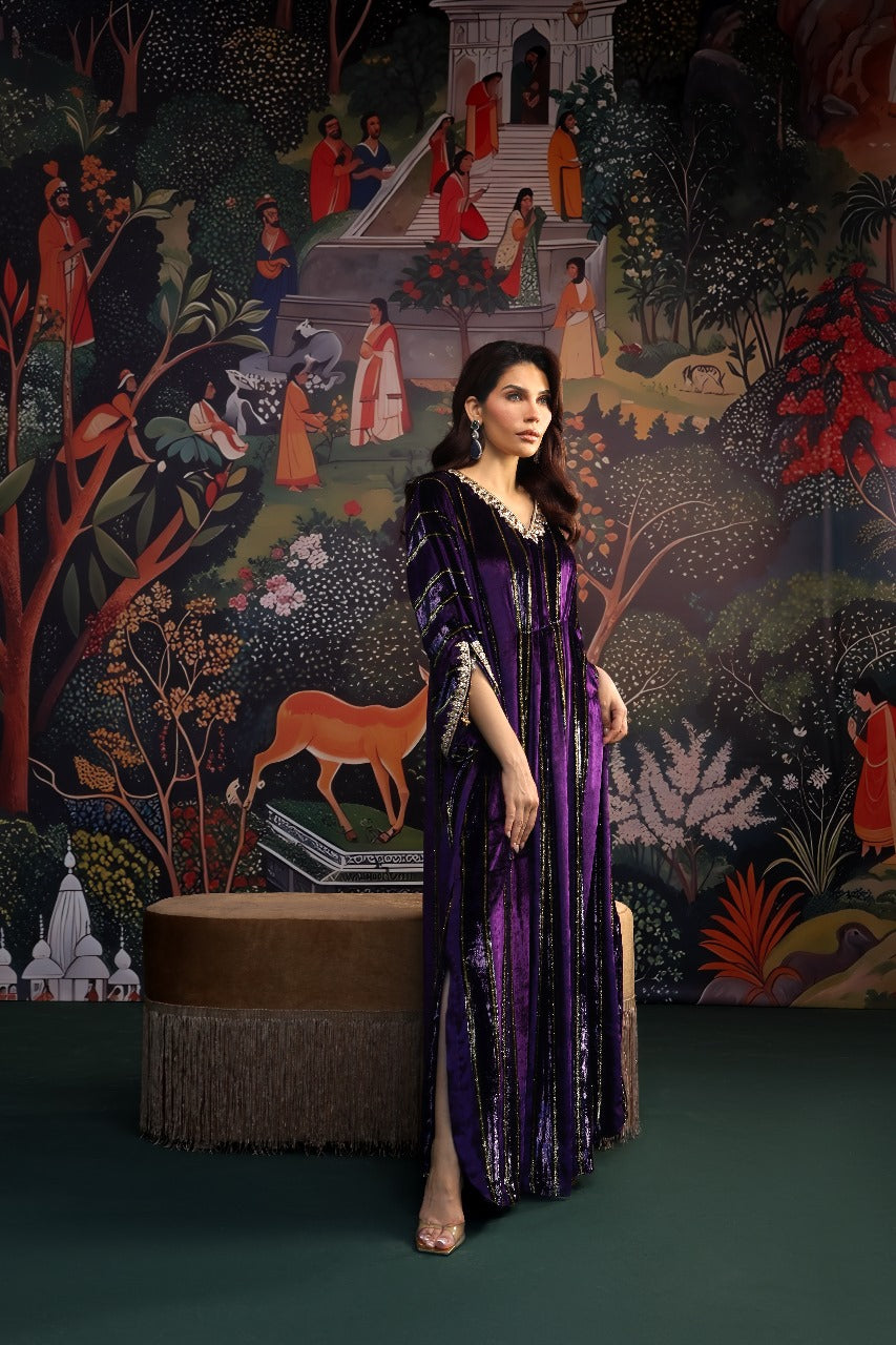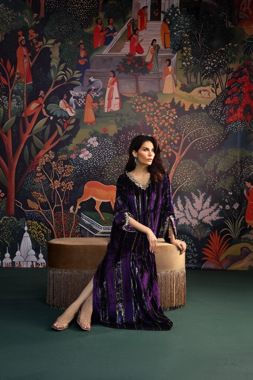 This sumptuous deep purple kaftan radiates effortless glamour. Crafted from plush velvet, it features intricate hand embellishments along the neckline and sleeves, adding a touch of refined artistry. The floor-length silhouette is ultra-flattering, enhanced with elegant tassel detailing and subtle side slits for graceful movement. Style it with your favourite heels and statement earrings for a head-turning look at any festive occasion this season