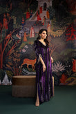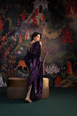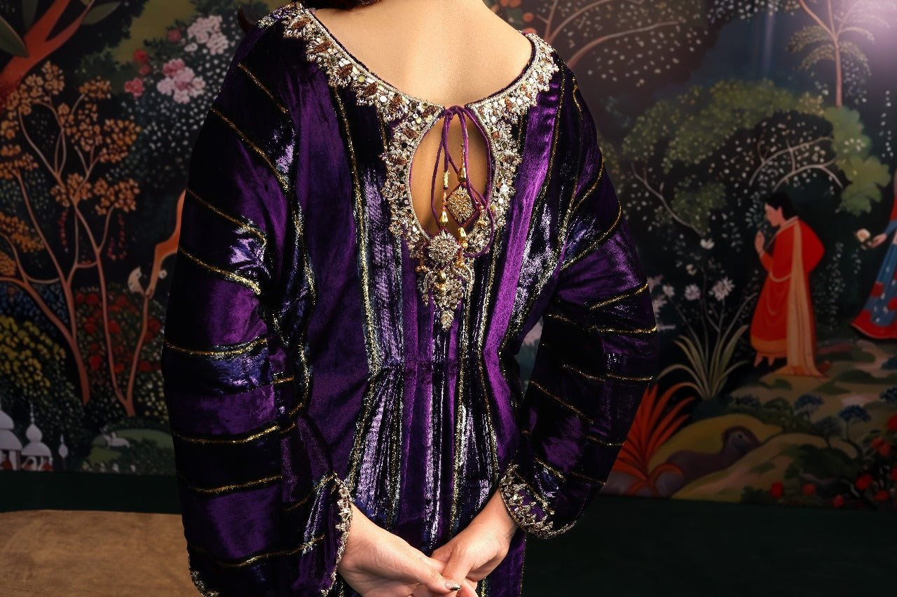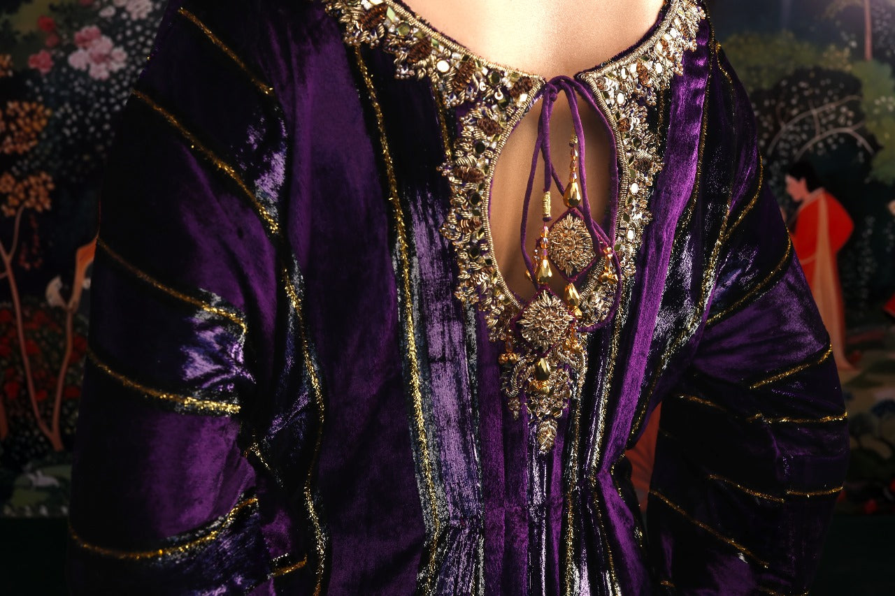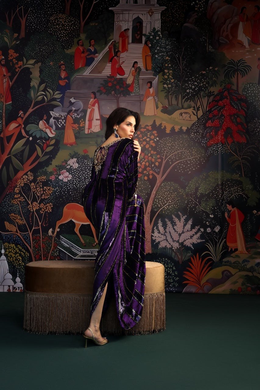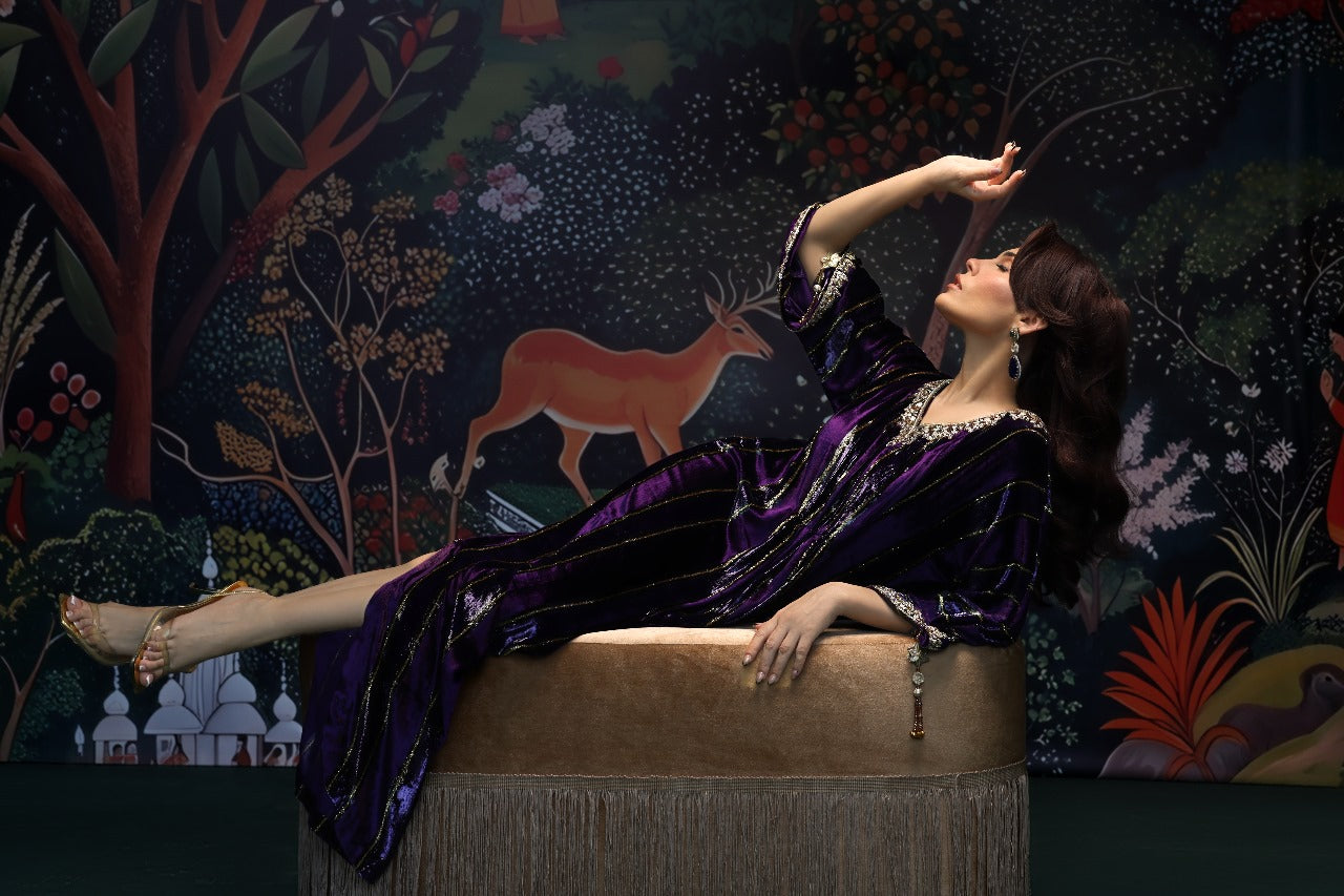 This sumptuous deep purple kaftan radiates effortless glamour. Crafted from plush velvet, it features intricate hand embellishments along the neckline and sleeves, adding a touch of refined artistry. The floor-length silhouette is ultra-flattering, enhanced with elegant tassel detailing and subtle side slits for graceful movement. Style it with your favourite heels and statement earrings for a head-turning look at any festive occasion this season
