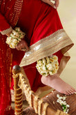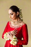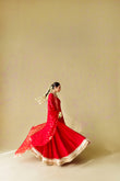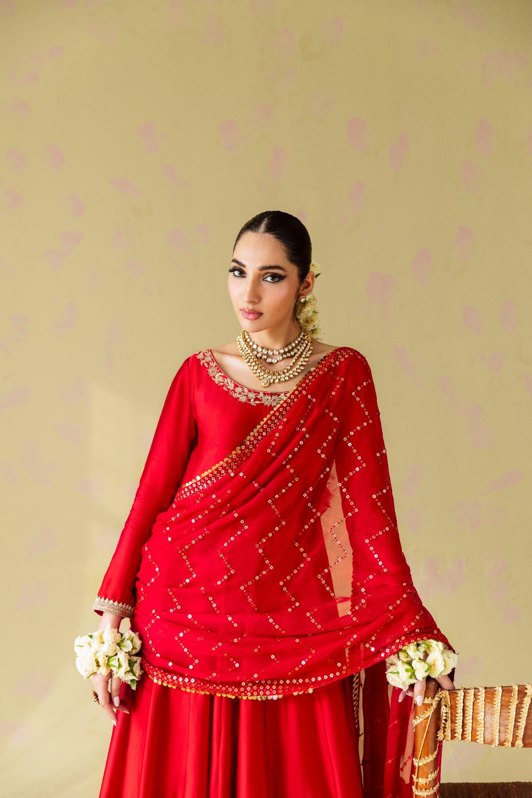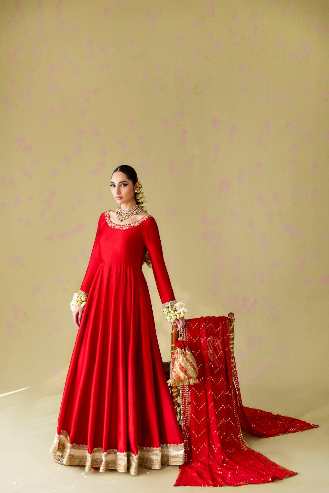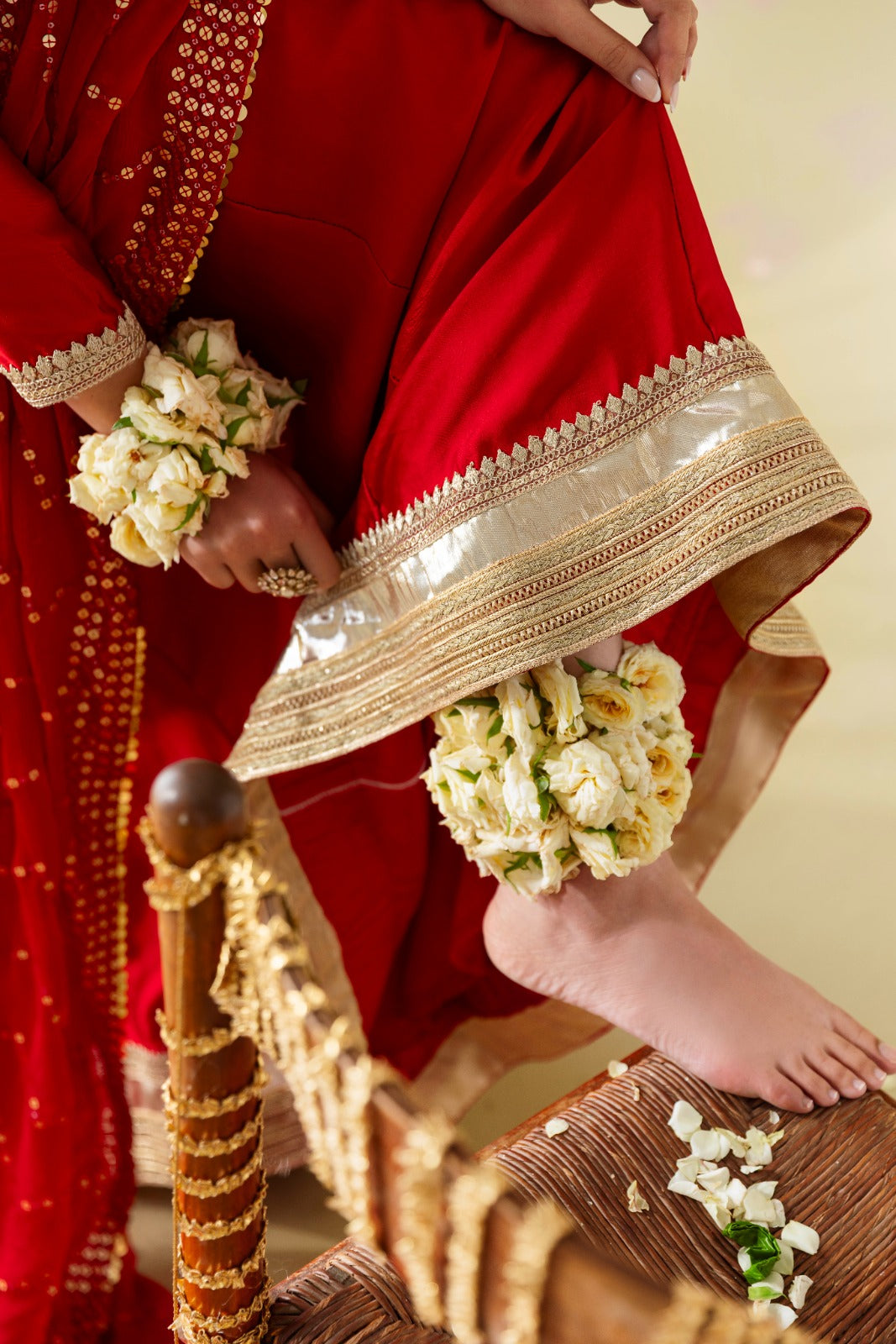 Marjan-Featuring rich lace borders that enhance its flow, the Marjan Peshwas boasts a neckline adorned with delicate gold floral embroidery and sleeves finished with gold-embellished lace, creating a stunningly elegant look.