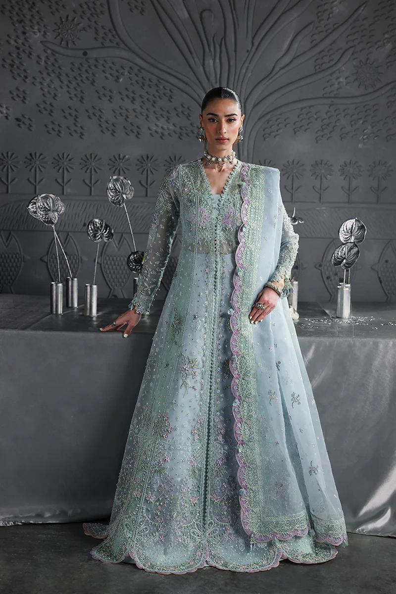 Elevate your festive look with Qalamkar’s MF-08 Serene Aqua, a masterpiece crafted on luxurious organza and raw silk. This stunning three-piece ensemble features exquisite hand-embellished embroidery, delicate detailing, and a regal silhouette that reflects timeless elegance.
