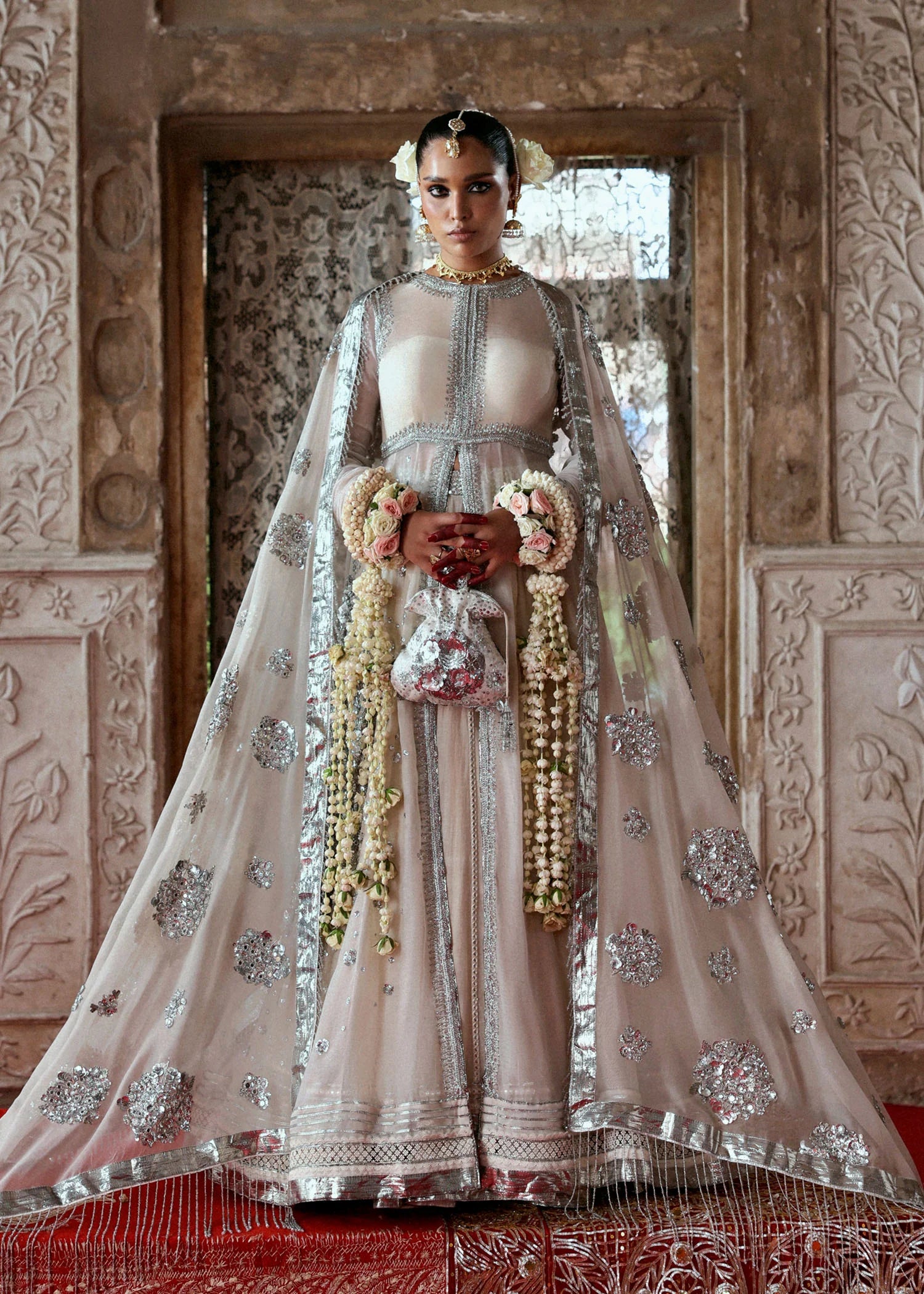 The front slit adds a contemporary edge, revealing a stunning Chanderi silk lehenga beneath, designed with a heavily composed border and an elegant sheesha work belt that enhances the silhouette with structured grace. Completing the ensemble is a lavish organza dupatta, exquisitely embellished with 3D hydrangeas, mirrors, sequins, and delicate threadwork. The floral detailing adds drama, depth, and movement, transforming the outfit into a visual masterpiece.
