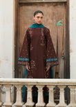 This elegant three-piece women’s outfit features a rich chocolate brown khaddar shirt, detailed with intricate embroidery on the front and a modern asymmetric neckline. The sleeves are accented with a contrasting turquoise embroidered patti, adding a refined pop of color. It is paired with beautifully embroidered khaddar culottes, finished with delicate lace detailing, and completed with a matching khaddar shawl in a contrasting turquoise tone for a sophisticated winter look.