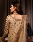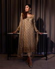 A silk net shirt is enhanced with antique dabka, nakshi and sitara work. It is paired up with jamawar pants speaks to times bygone. One side framework border on the Dupatta completes the entire look of the outfit.