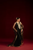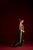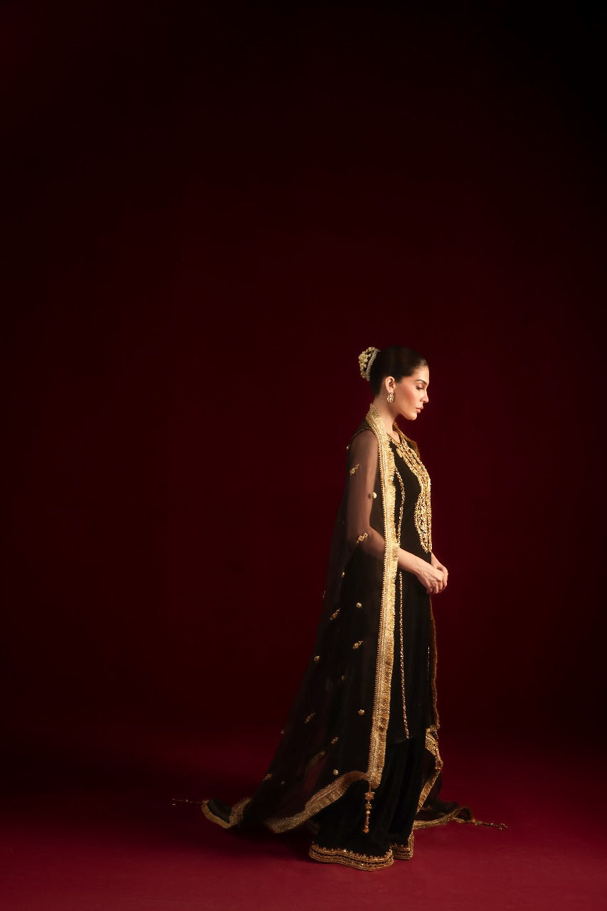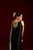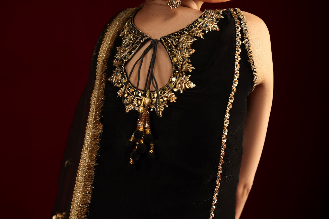 Nisha - A steel gray set, cut in plush velvet with a statement neckline and pants, with a heavily embellished handwork, Paired woth a gota sitara dupatta.