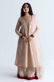 The look is completed with a pink organza dupatta, delicately edged with small scallops and adorned with pan-shaped motifs, creating a refined and graceful ensemble.
