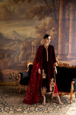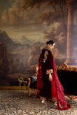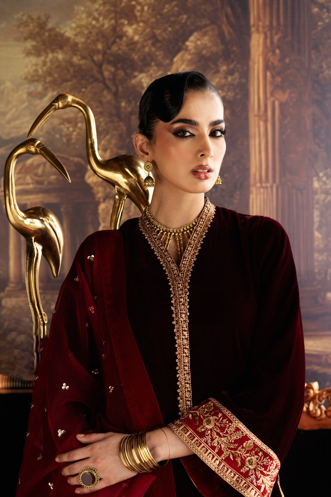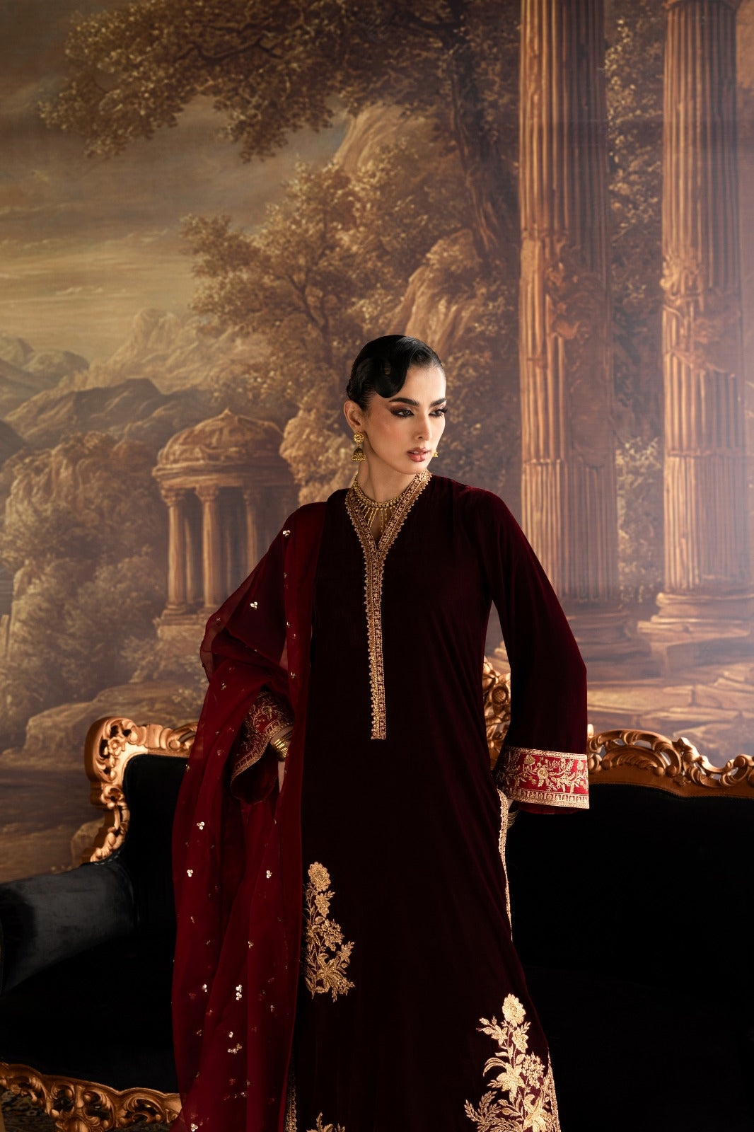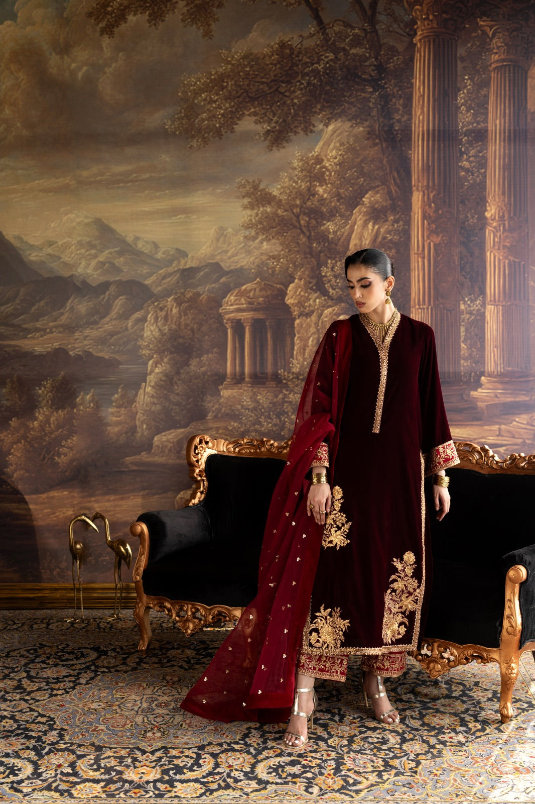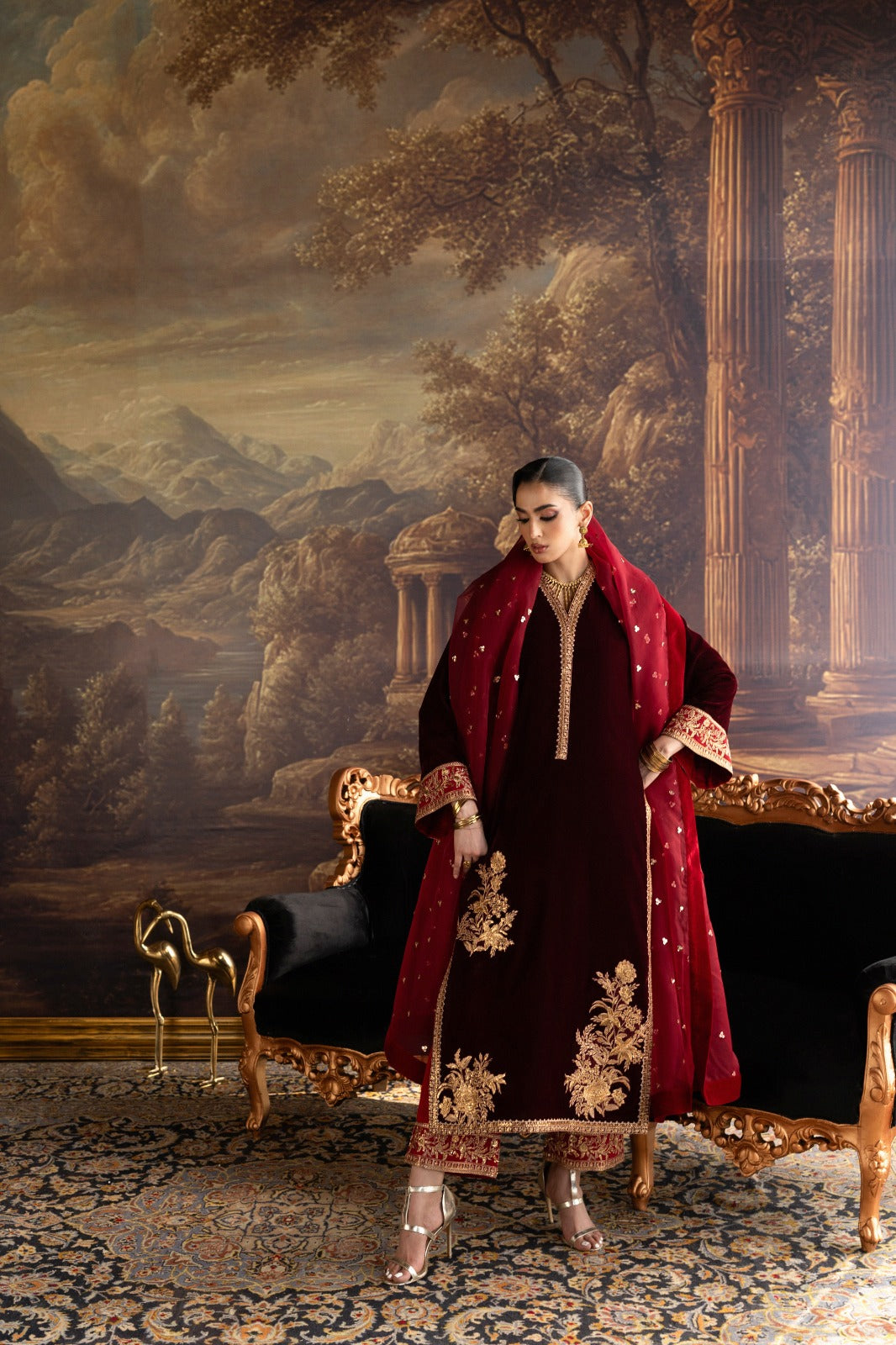 A magnificent three-piece ensemble crafted from sumptuously rich maroon velvet, designed to embody timeless grace and regal sophistication. The classic straight-cut kurta is exquisitely adorned with intricate gold tilla embroidery, delicately outlining the neckline and framing the cuffs in an ornate, traditional pattern.
