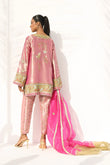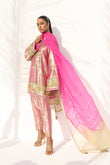 Paired with a structured brocade shalwar featuring subtly embroidered borders in lime and fuchsia, the outfit achieves a harmonious balance of texture and color. Completing the look is a gossamer ombré organza dupatta in fuchsia and champagne, detailed with elegant gota accents, bringing airy, effortless grace to the ensemble.