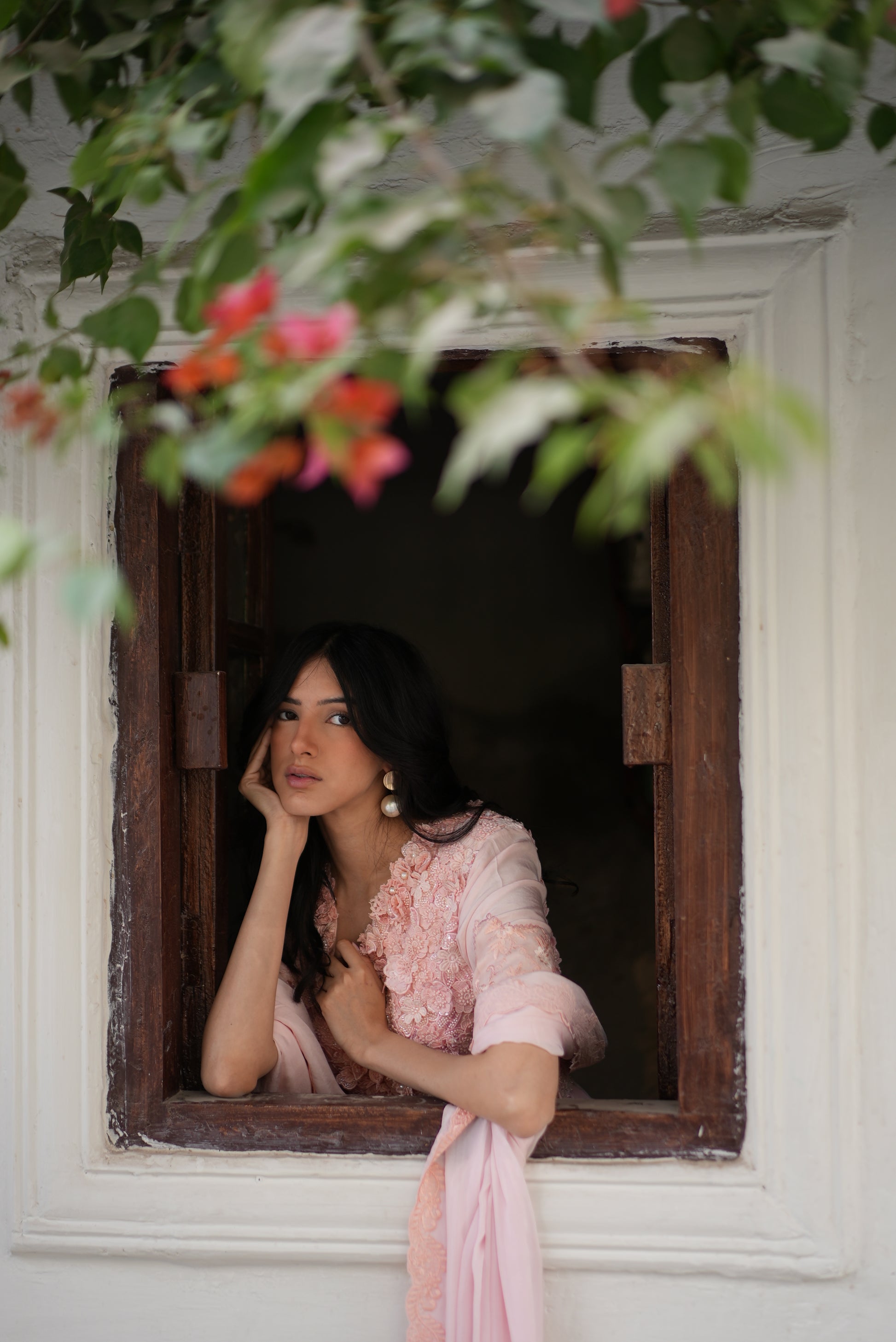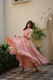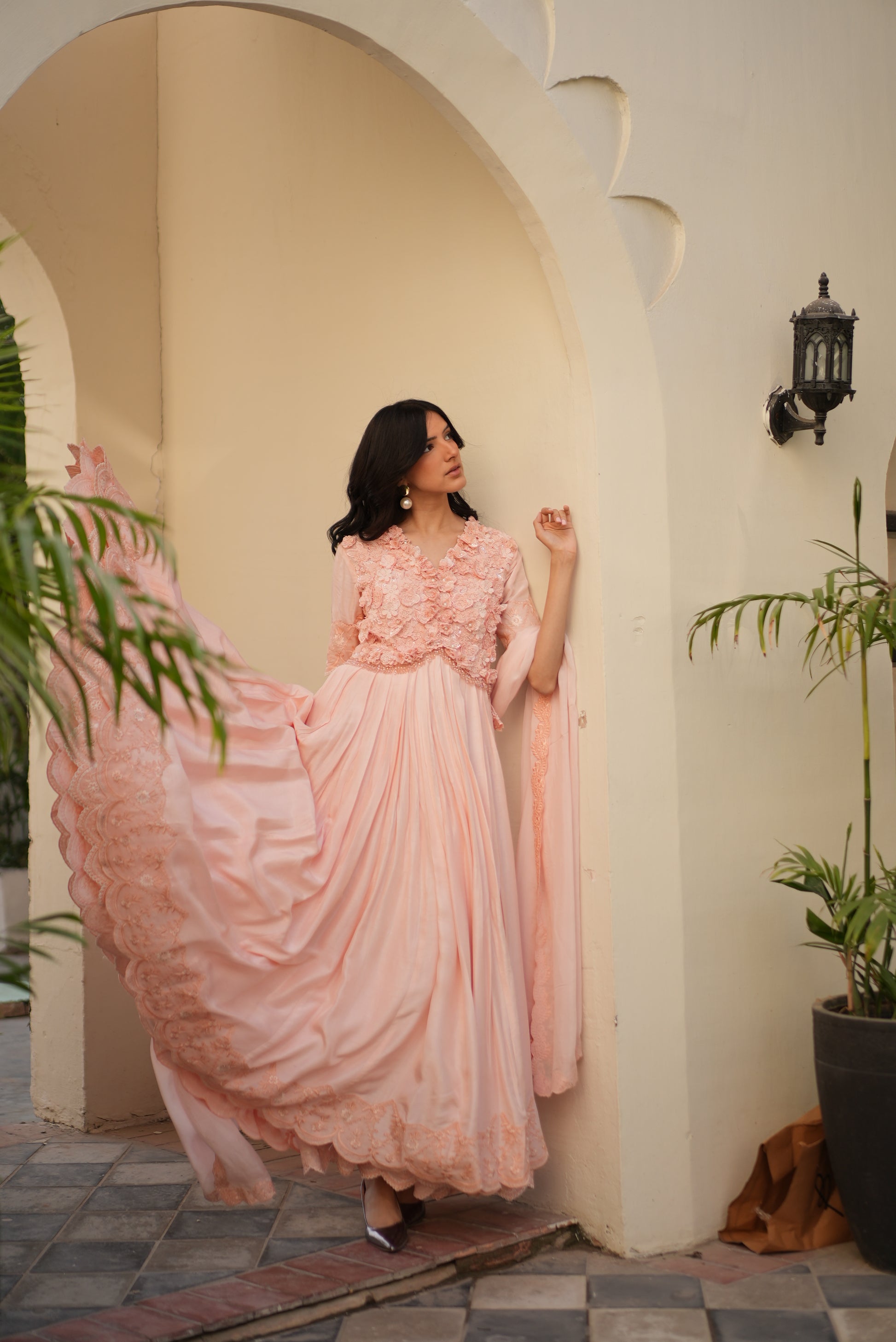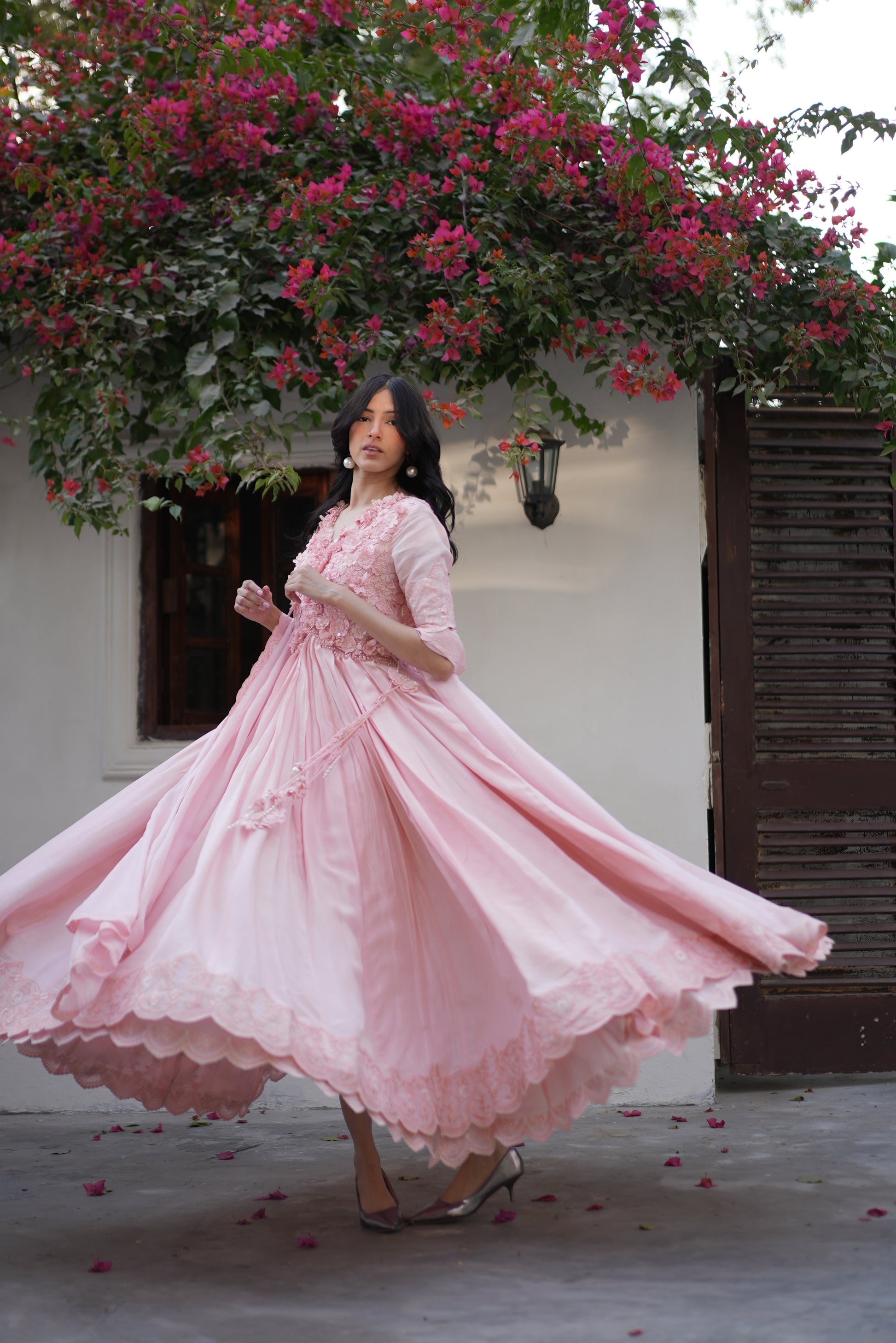 Pink Petal is a refined pink pishwas designed with a graceful flair silhouette. Intricately adorned with floral appliqué, hand-set pearls, crystals, and delicate tassel accents, this ensemble embodies fluid elegance and understated luxury—perfect for sophisticated occasions.