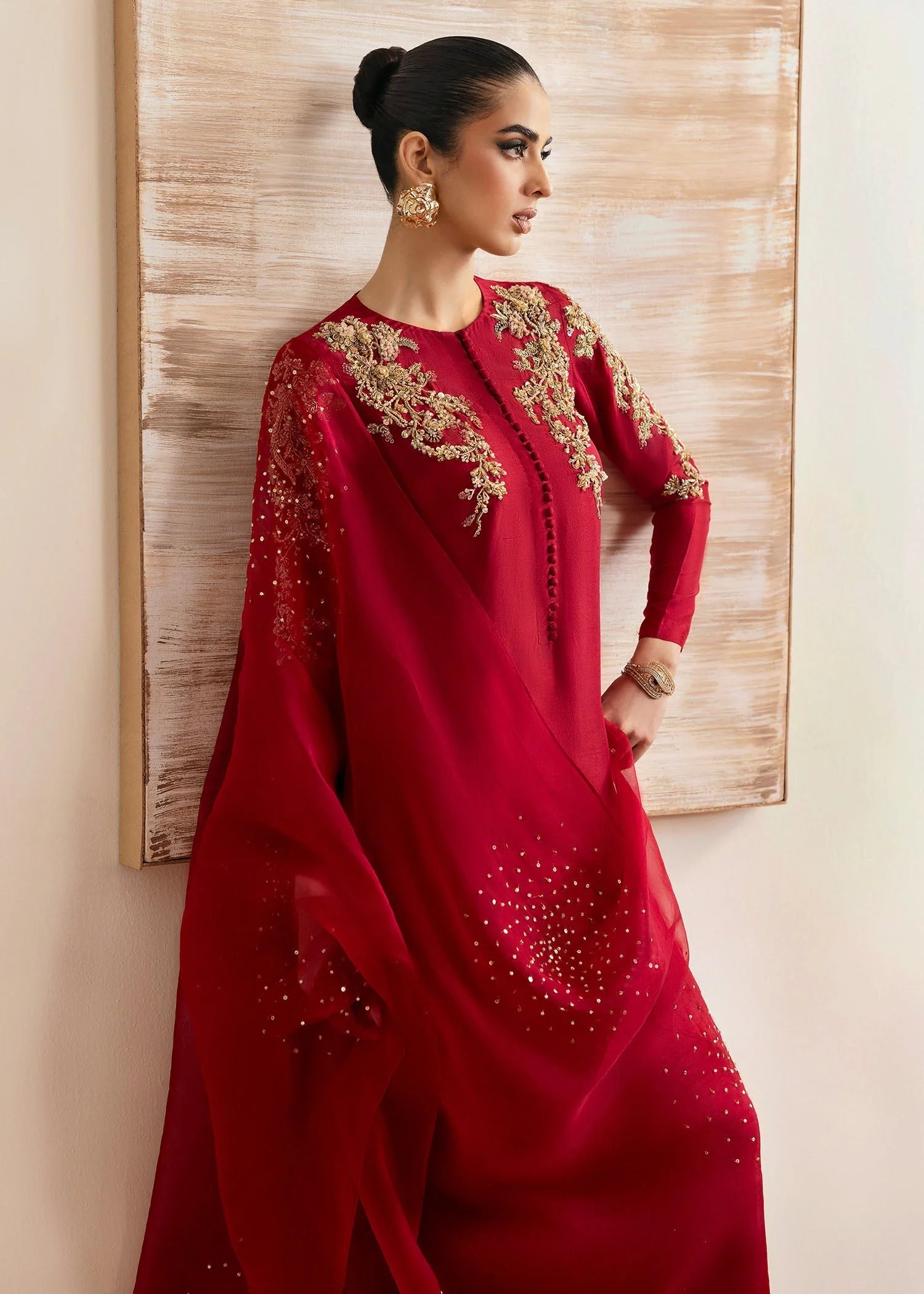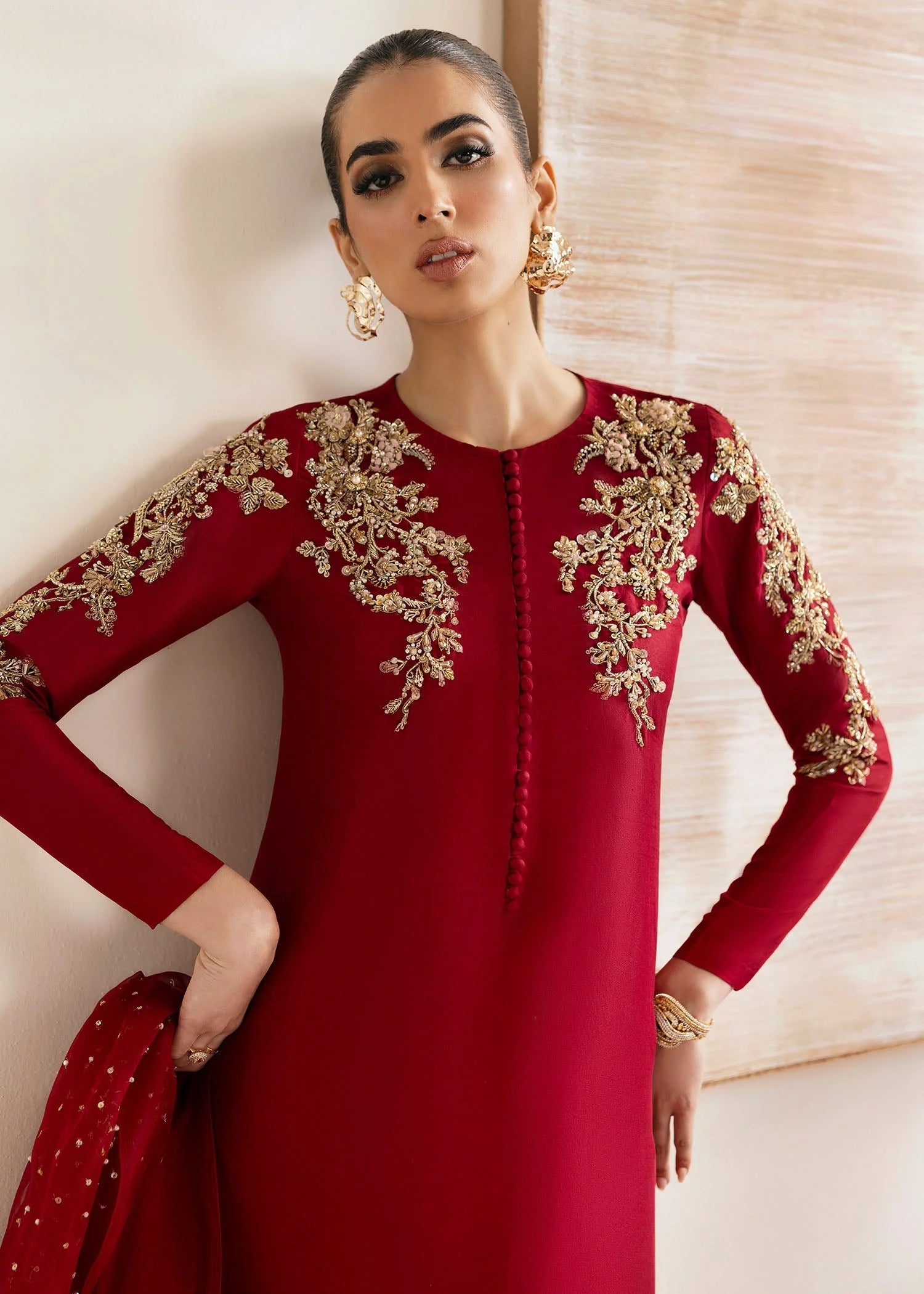 Indulge in the opulence of Rosina, where classic femininity meets modern design. The deep crimson silk offers a graceful flow that complements the figure, while the meticulously hand-embellished neckline and sleeves lend texture and visual intrigue. The cigarette pants are tailored to perfection,providing a sharp, modern balance to the flowing top. The Kathan organza dupatta,adorned with scattered embellishments,creates an ethereal aura that softens the look,adding depth and movement.