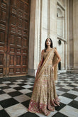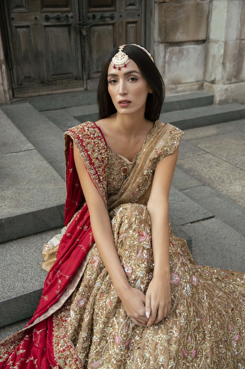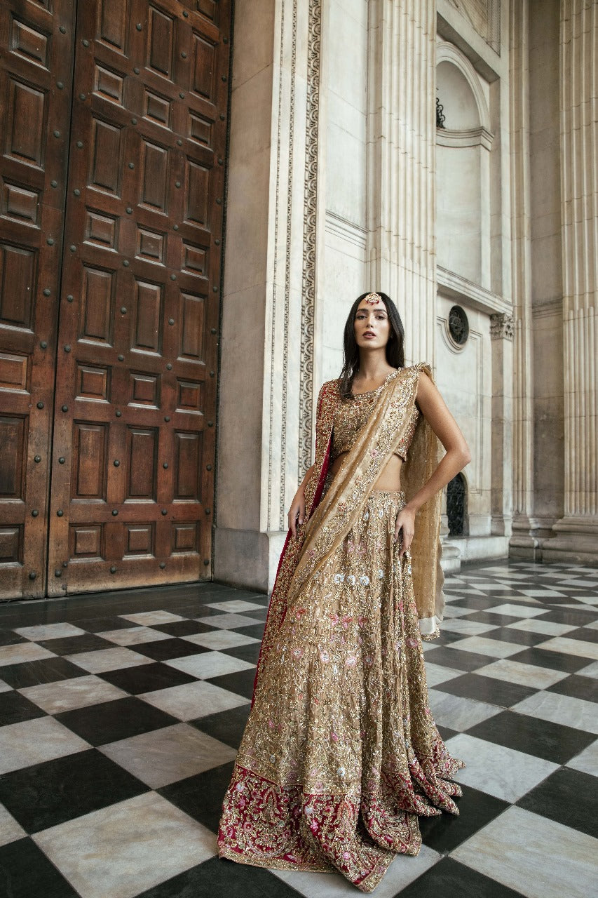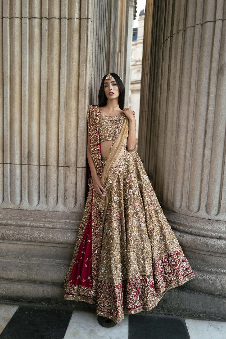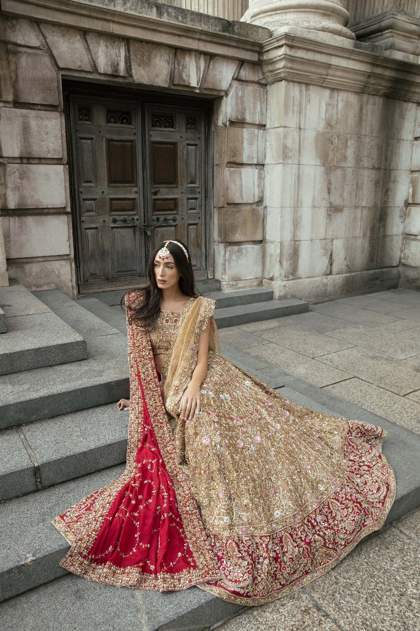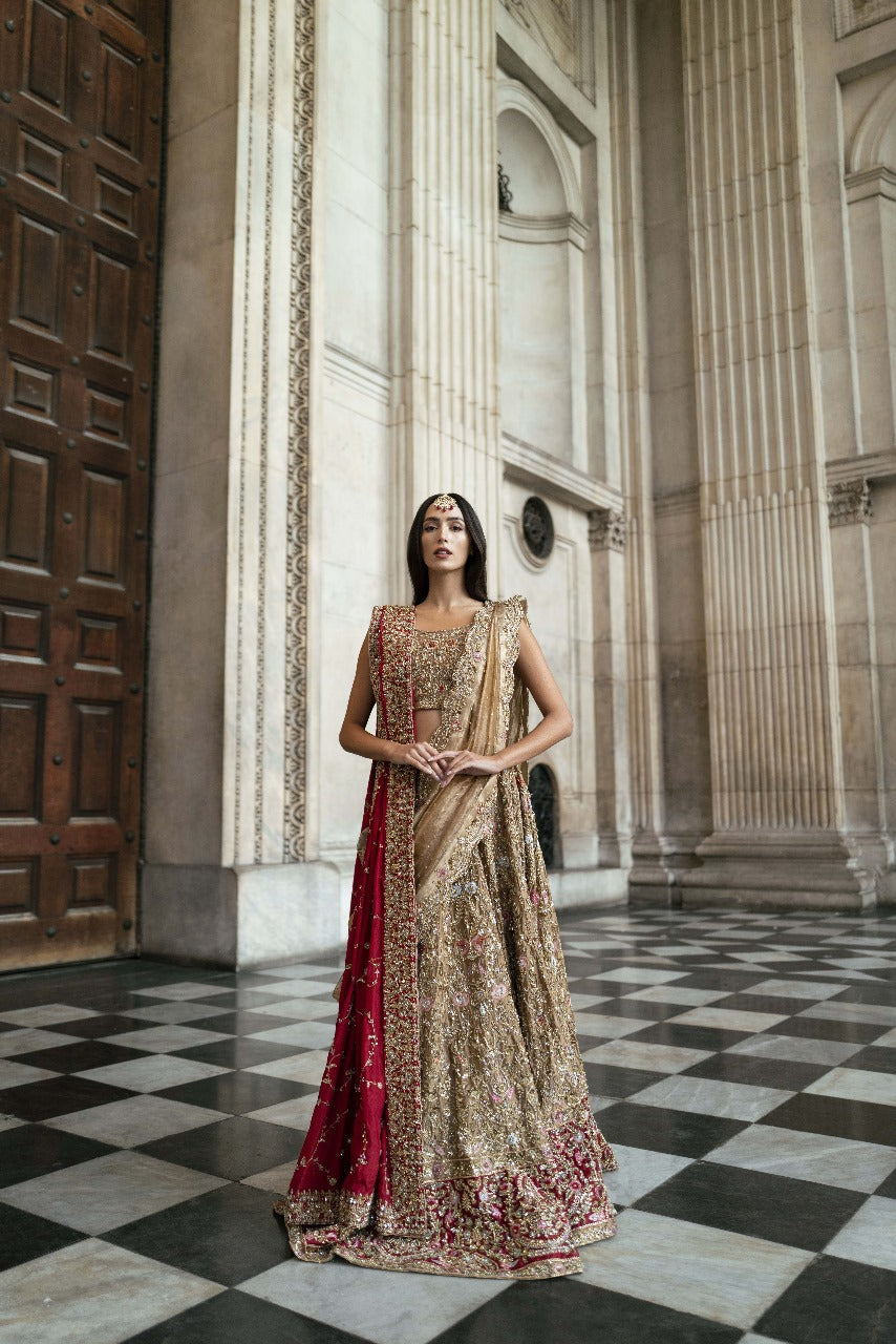 Drenched in a stunning gold palette with deep red accents and touches of pink resham, this ensemble offers a look that is both classic and luxurious.