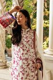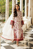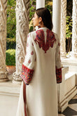 The ethereal white shirt is adorned with a playful floral pattern with Kashmiri embroidery, reminiscent of ruby-red blooms dancing in the breeze. The back of the dress is a stunning showcase of Kashmiri artistry. A vibrant tapestry of hand-embroidered motifs in rich colors adorns the back.The look is completed with a pair of plain raw silk pants & a pure chiffon dupatta, finished with a delicate jamawar border, adding a touch of ethereal charm.