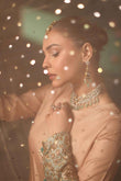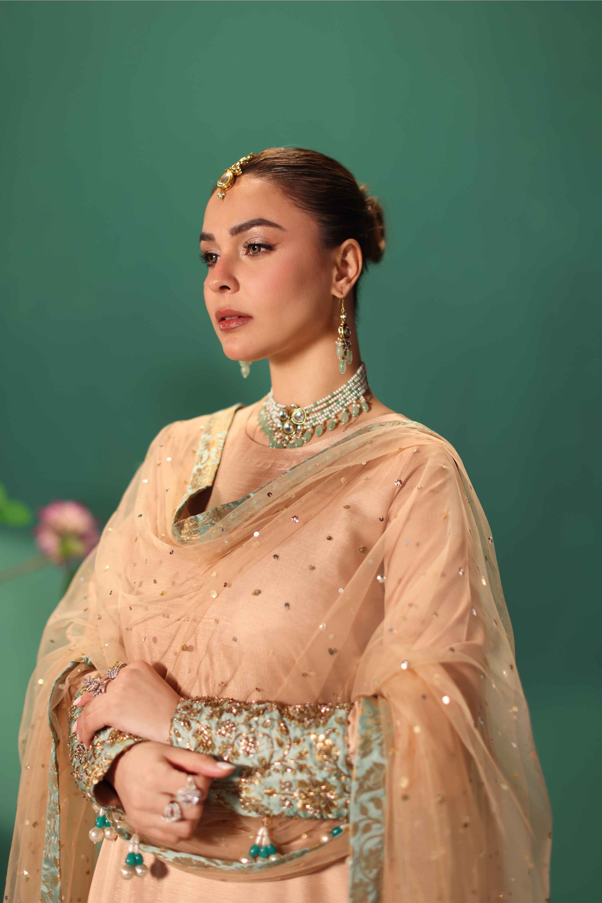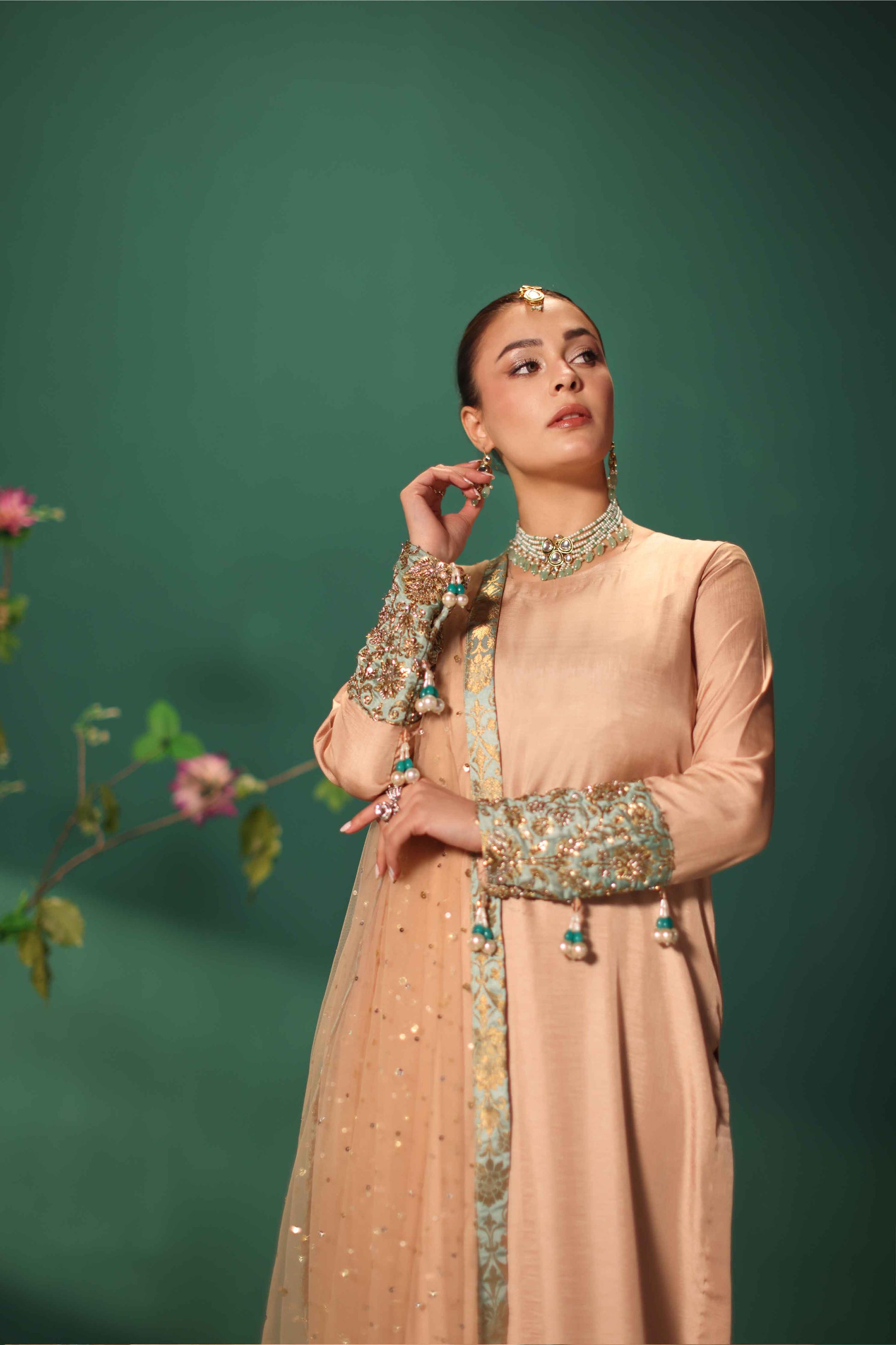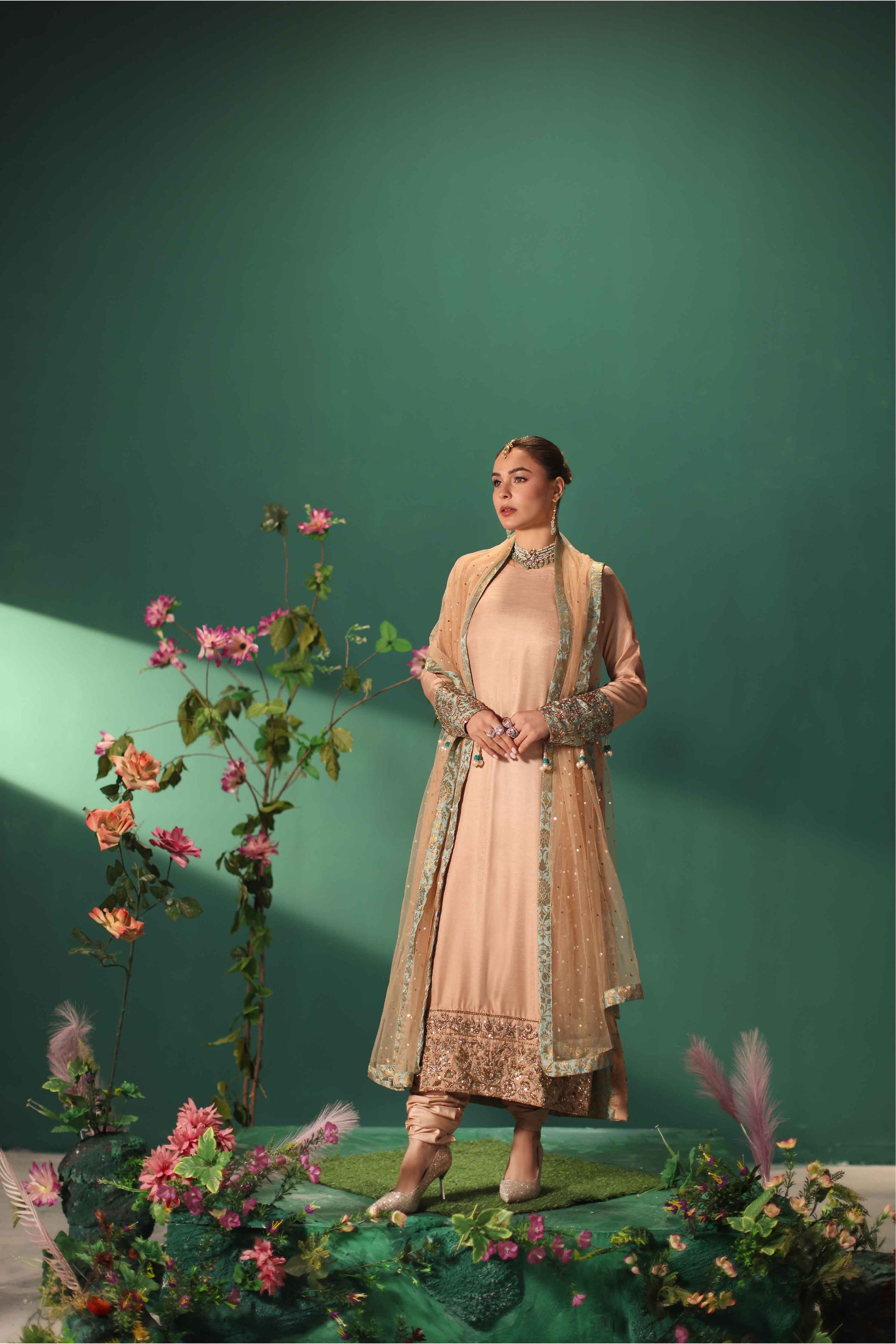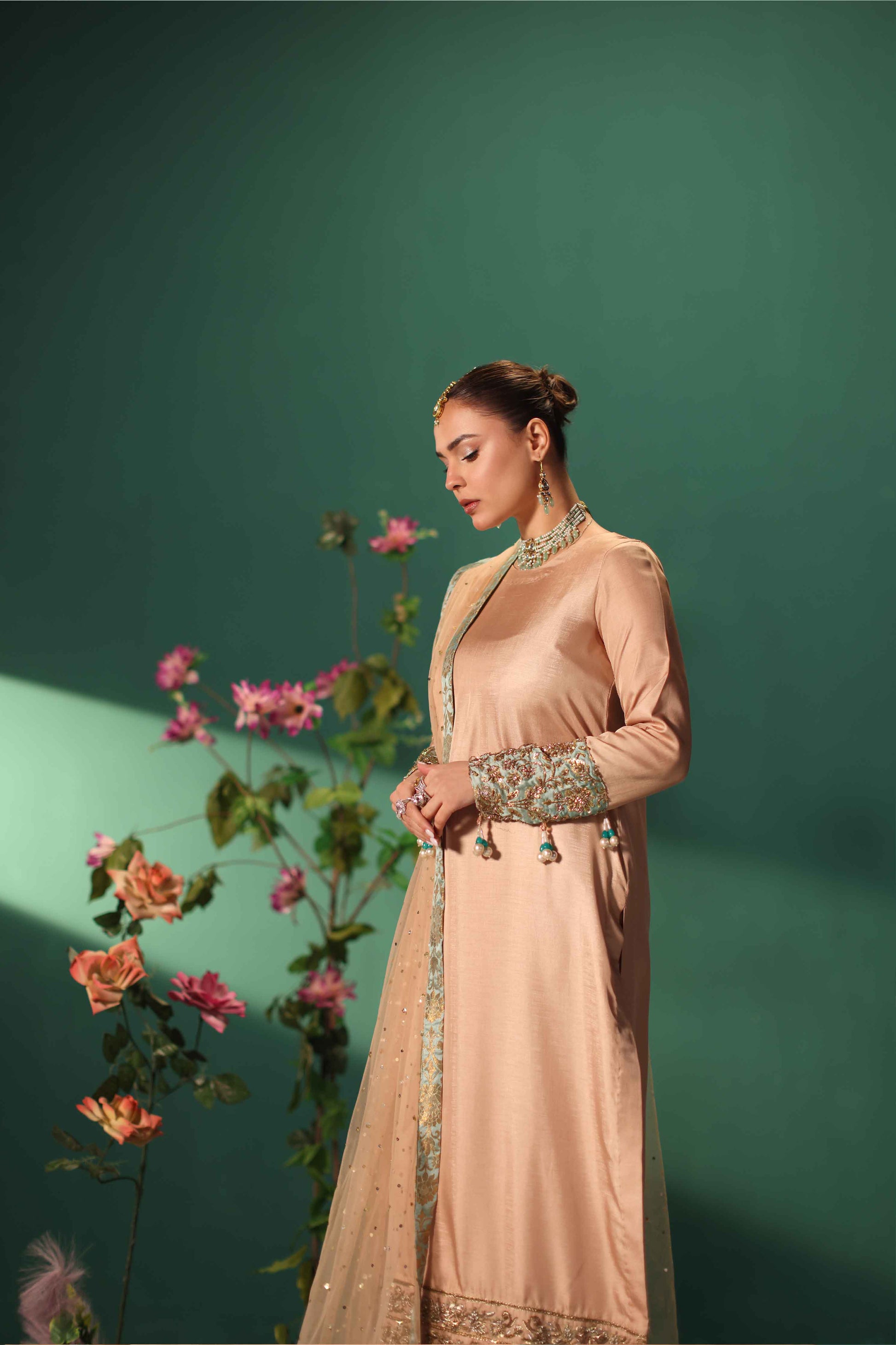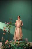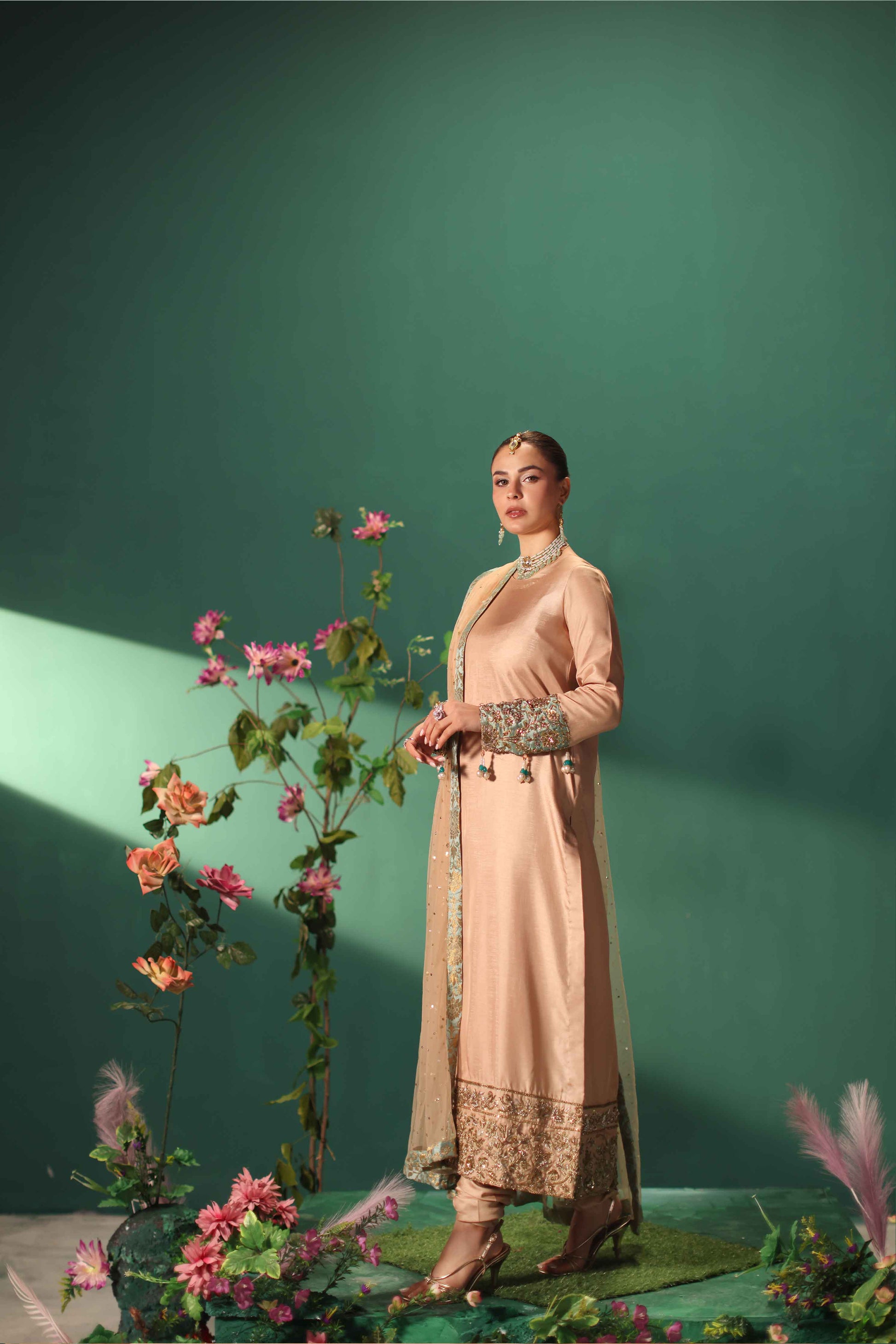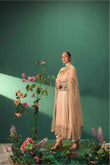 A flowing silk shirt in beige tone, delicately detailed along the sleeves and hem with intricate butterwork. Paired with a silk churidar and a net dupatta lavishly adorned with sequins, beads, and pearls, this ensemble exudes ethereal elegance perfect for festive celebrations and wedding soirées.