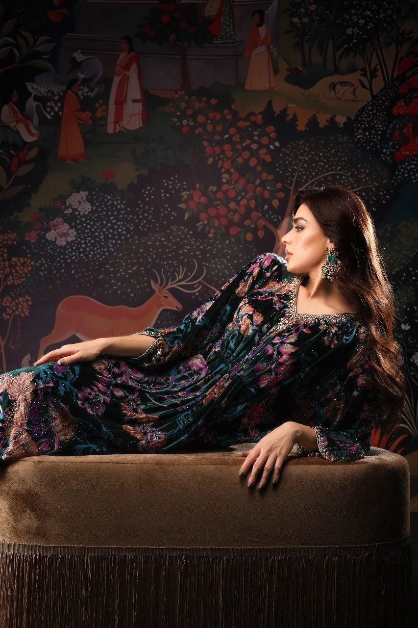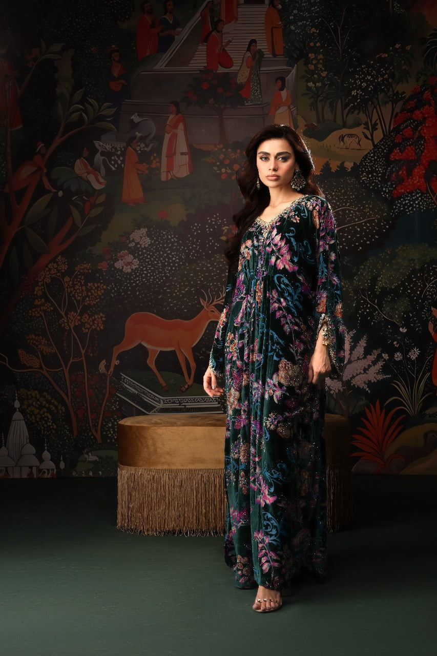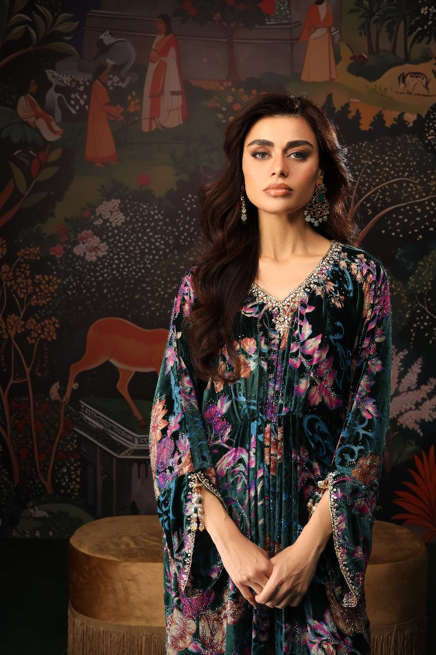 This stunning floral velvet kaftan is the perfect blend of elegance and modern charm. Adorned with a shimmering burst of crystals, it catches the light beautifully from every angle. The neckline features delicate hand embellishments that elevate its luxurious appeal, while the signature MDR statement back neckline adds a touch of bold sophistication. Finished with graceful tassel detailing on the sleeves, this chic kaftan flows effortlessly with a full length of 58 inches, making it an ideal choice for refined festive and evening looks.