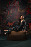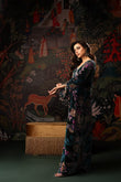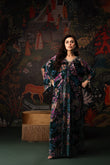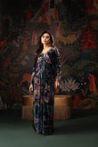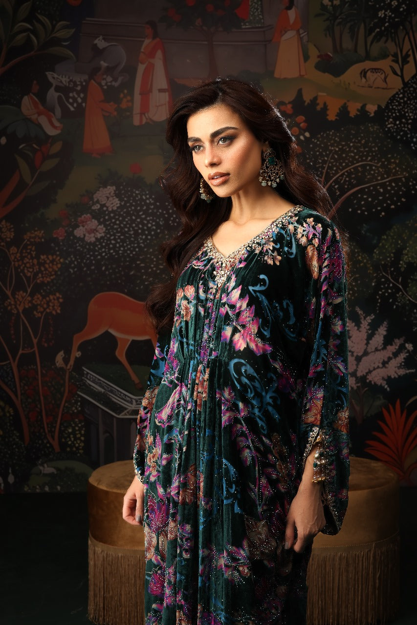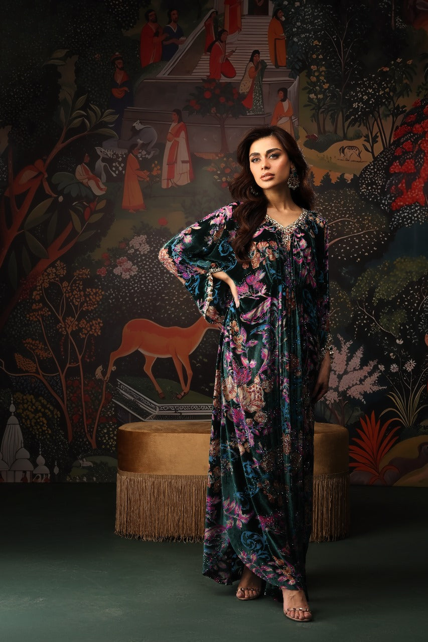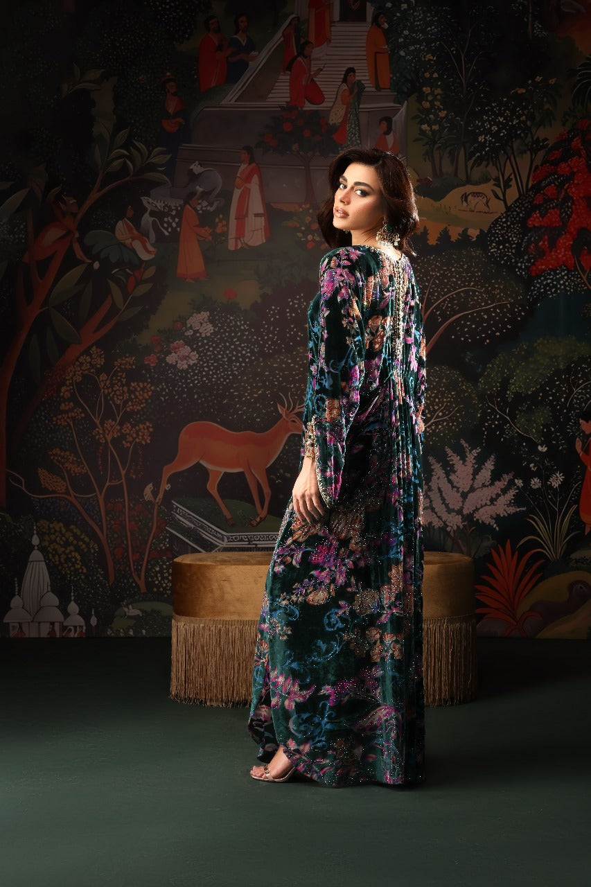 This stunning floral velvet kaftan is the perfect blend of elegance and modern charm. Adorned with a shimmering burst of crystals, it catches the light beautifully from every angle. The neckline features delicate hand embellishments that elevate its luxurious appeal, while the signature MDR statement back neckline adds a touch of bold sophistication. Finished with graceful tassel detailing on the sleeves, this chic kaftan flows effortlessly with a full length of 58 inches, making it an ideal choice for refined festive and evening looks.