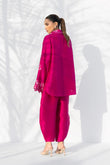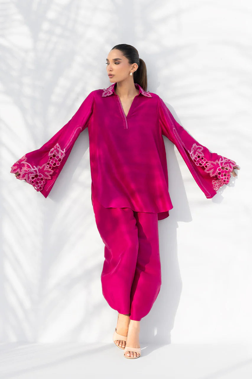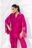 A vibrant fuchsia statement crafted in pure Raw Silk, this ensemble is designed to command attention with effortless elegance. The contemporary silhouette features a relaxed-fit shirt with a refined V-neck collar and dramatic cape sleeves. Intricate cutwork embroidery and appliqué detailing add depth, texture, and artisanal charm to the look.