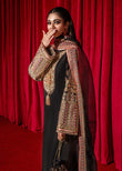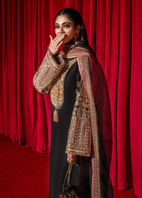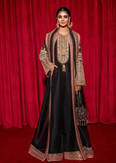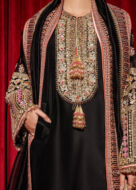 This classic black raw silk long shirt has work details of golden nakshi, sequins, gotta, pink and green cut dana. Organza sleeves are heavily embellished with pink orange and green sequins, cut dana and kiran at the hem. The shirt has pockets on the sides and it is paired with black raw silk palazzo pants with boarders embroidered and embellished with sequins, The outfit contains 3.5 yards organza dupatta which has a heavily embellished border as well.