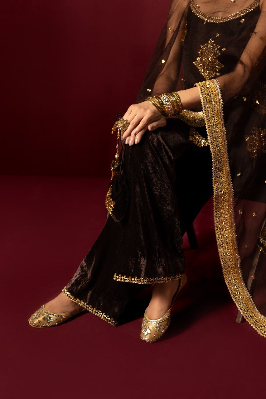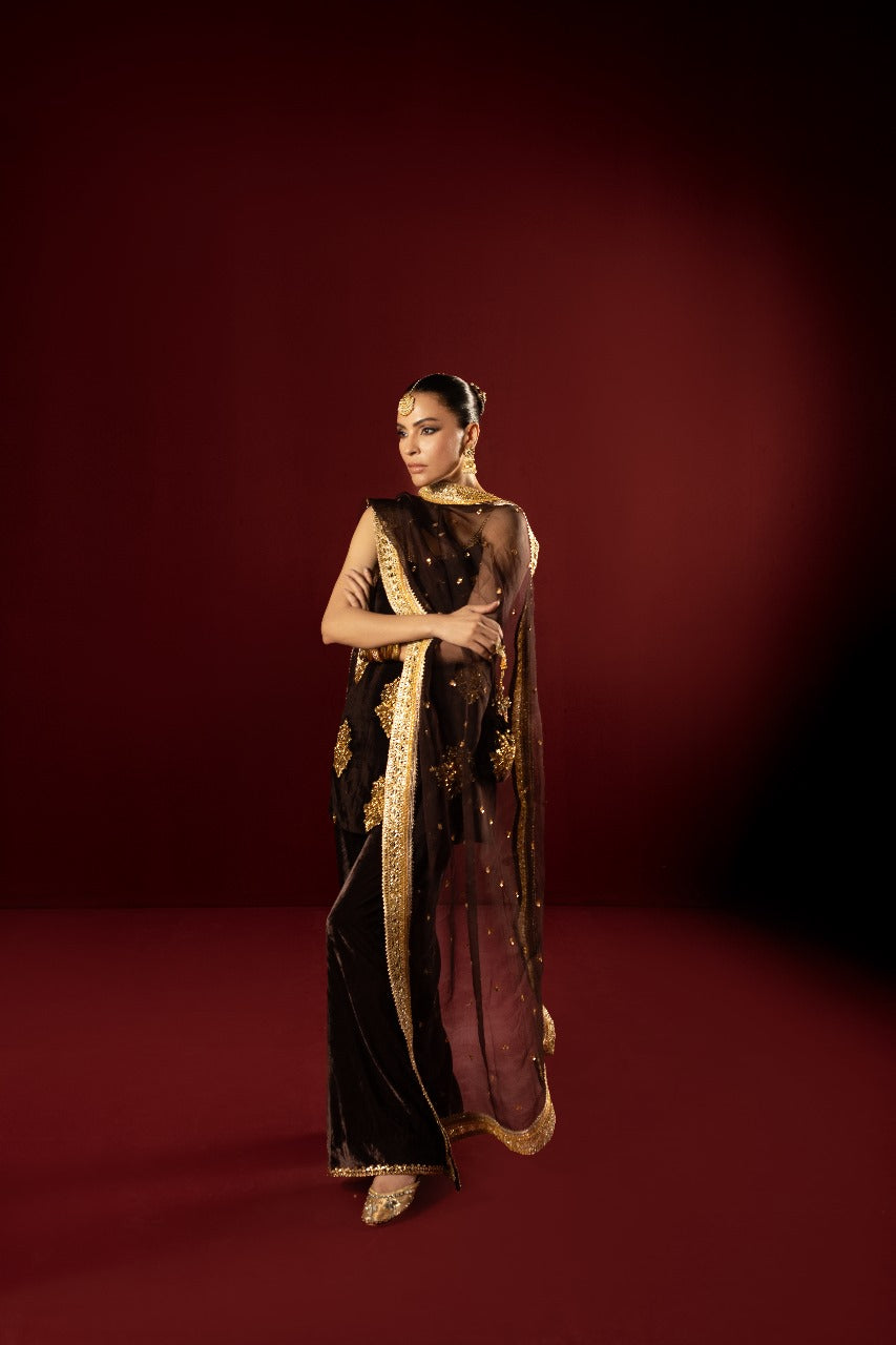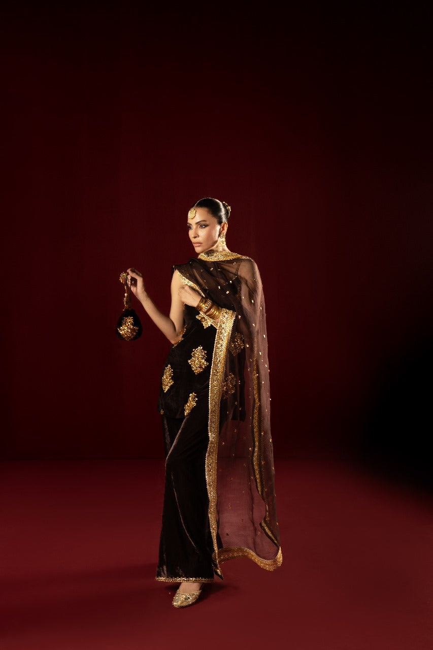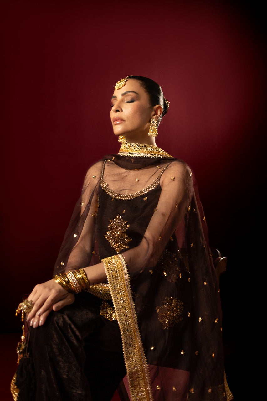 The Sultana Set is designed for the modern woman who embraces contemporary elegance. Featuring a chic short shirt with delicate strappy shoulders, it is adorned with finely handworked motifs that add a touch of artisanal charm. Paired with a classic shalwar and a graceful chun boti dupatta, this ensemble strikes the perfect balance between tradition and modern style. The shirt length is 30 inches, and the model is wearing a Small.