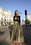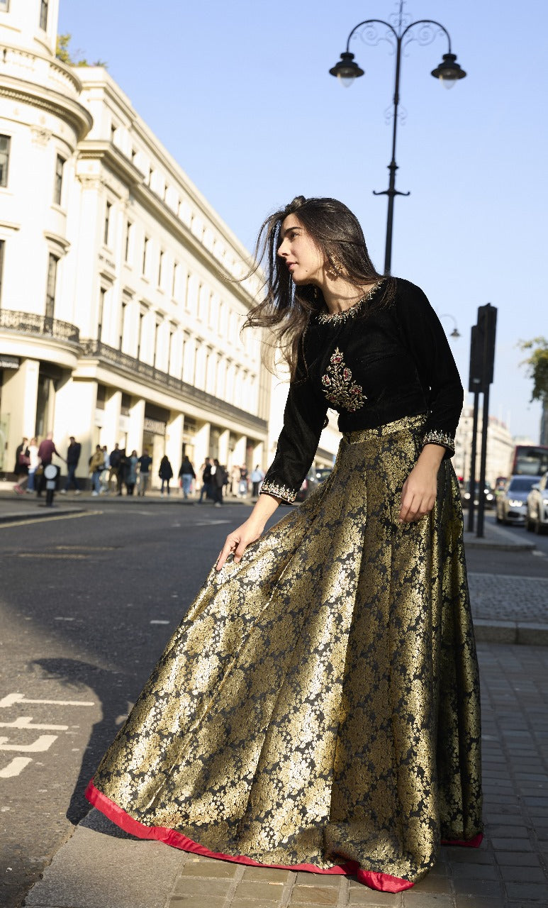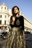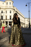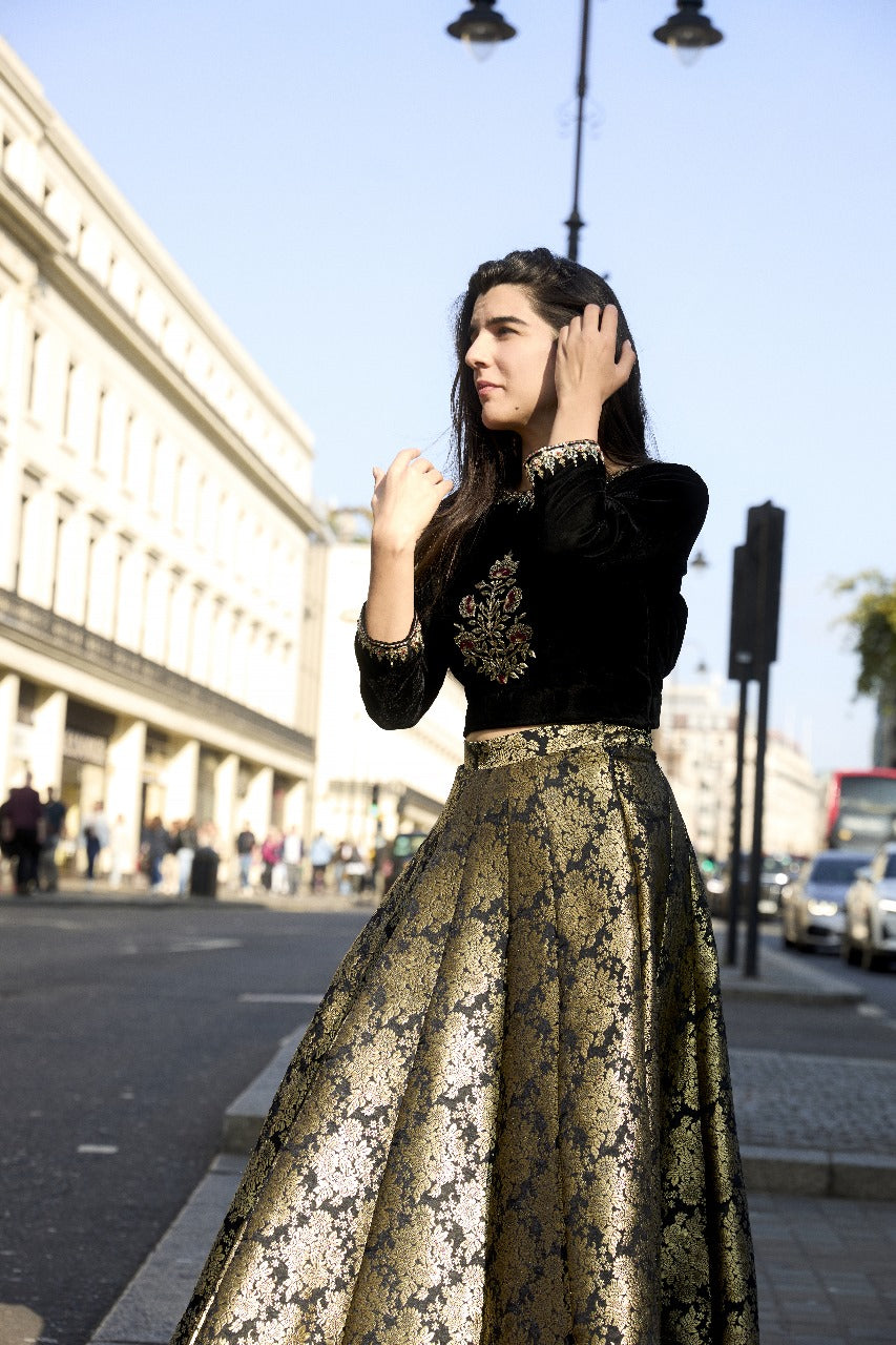 Victoria features an exquisite black velvet choli paired with a jamawar lehenga. The choli showcases a Mughal-inspired motif intricately embellished with sequins, pink and green resham, nakshi, and mukaish, highlighted by a stunning central design. It is complemented by a green organza dupatta adorned with all-over lace and a beautifully detailed border, completing the regal ensemble.