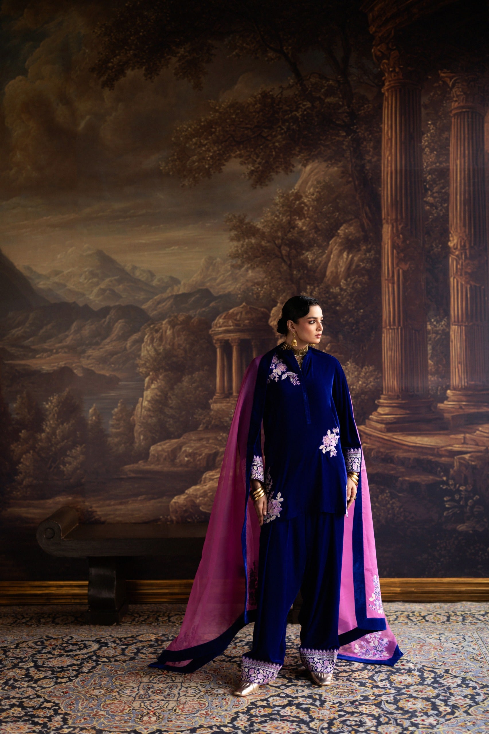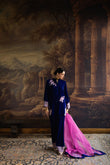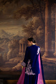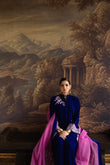 This exquisite ensemble exudes effortless chic and modern elegance, crafted from sumptuous deep cobalt blue velvet that drapes beautifully with a flattering, graceful flow. The richness of the velvet is delicately enhanced with silver and soft pink floral embroidery, artfully scattered across the kurta and sleeves to create an ethereal, refined appeal.