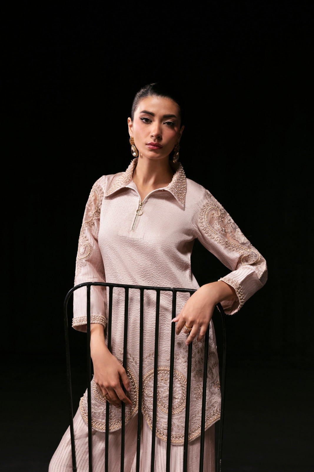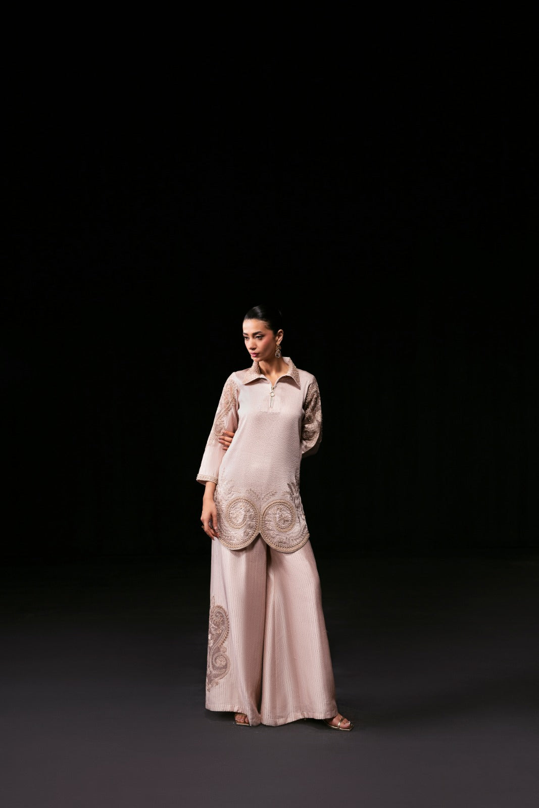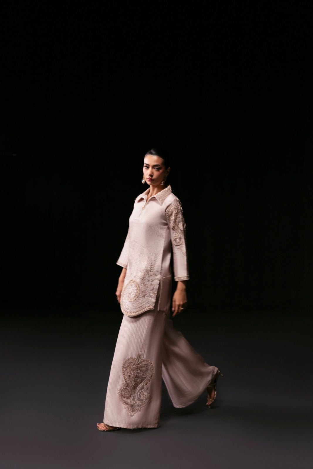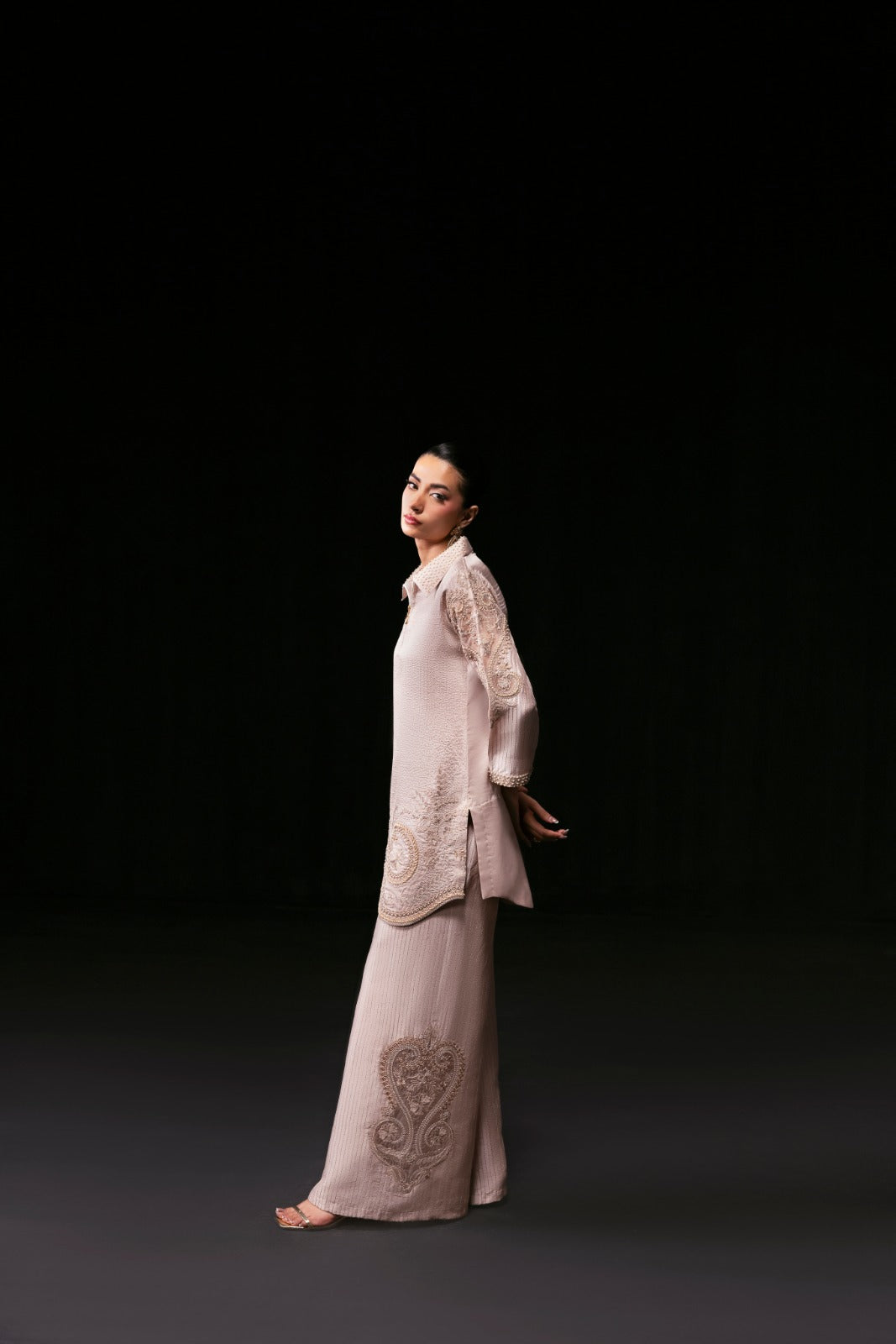 Elevate your style with the Vogue Dress, a luxurious ensemble crafted from pure embroidered silk. The shirt is beautifully adorned with intricate pearl and sequin embellishments on the collar, sleeves, and daman, creating a subtle shimmering allure. Paired with a pure silk embroidered Dhaka pajama, also detailed with pearls and sequins, this outfit exudes elegance and sophistication—perfect for special occasions and timeless glamour.