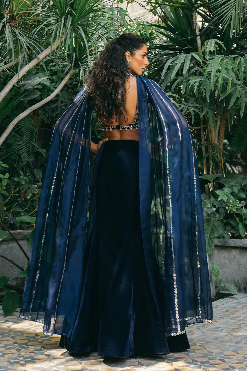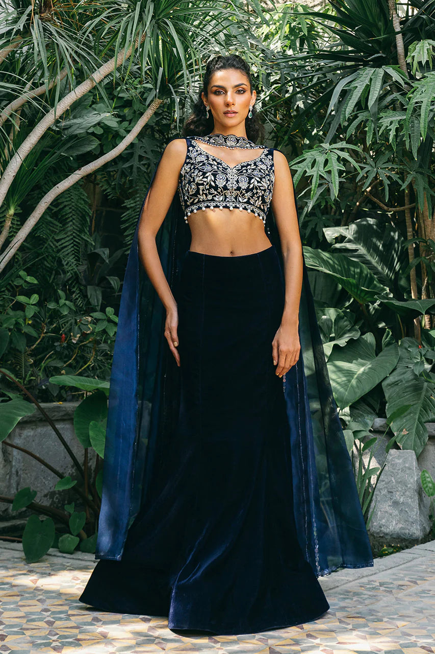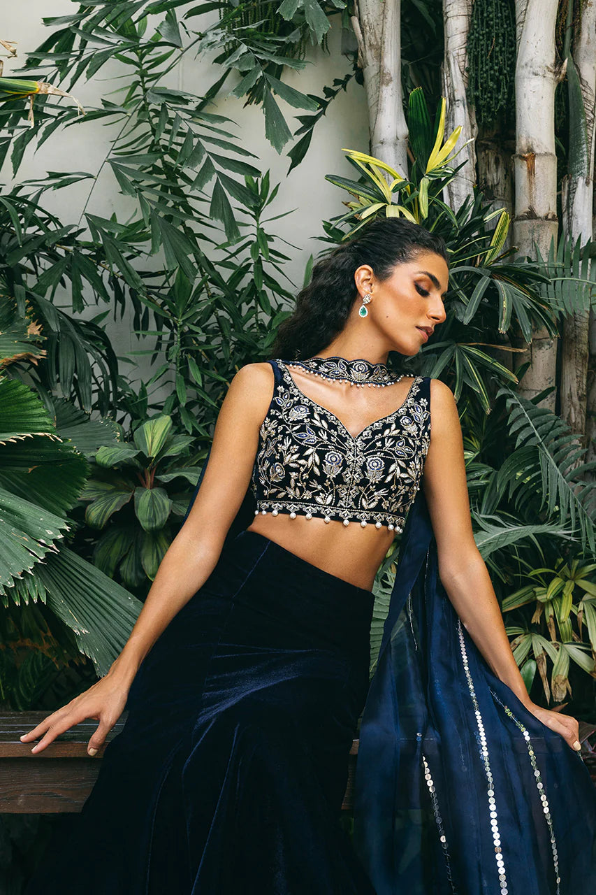 Step into regal elegance with this midnight blue velvet lehenga set, crafted for a dreamy winter evening.
